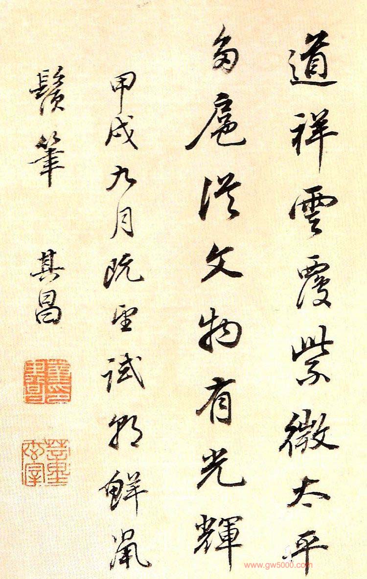 款识:甲戌九月既望,试朝鲜鼠须笔。其昌。