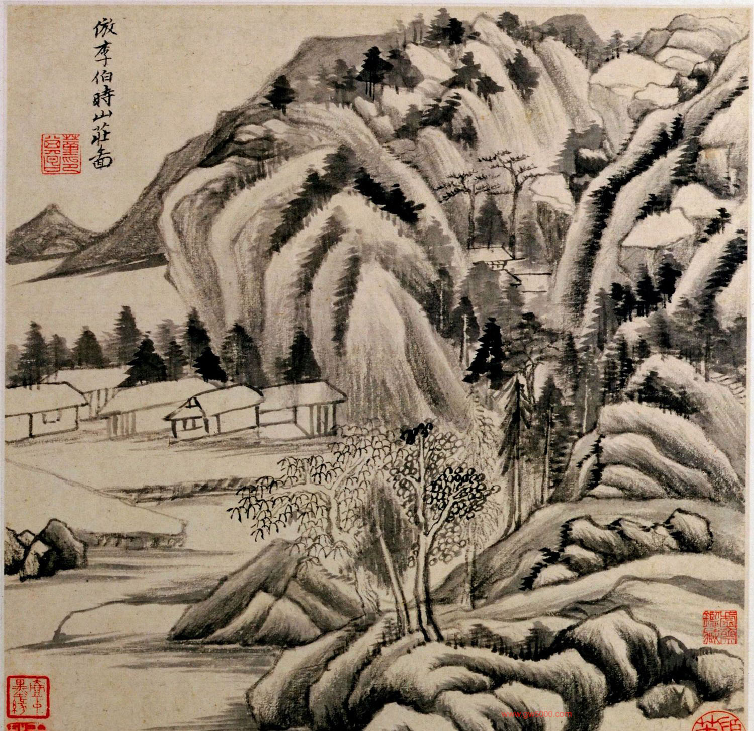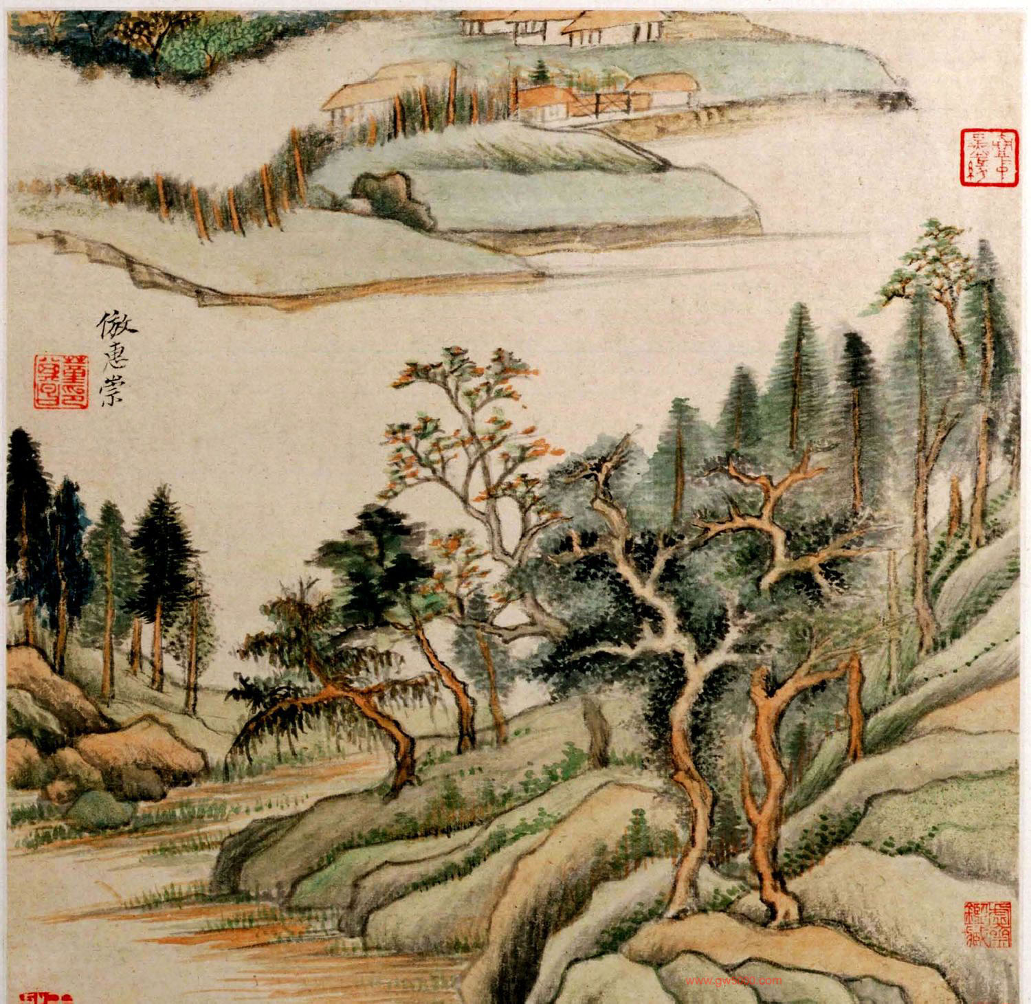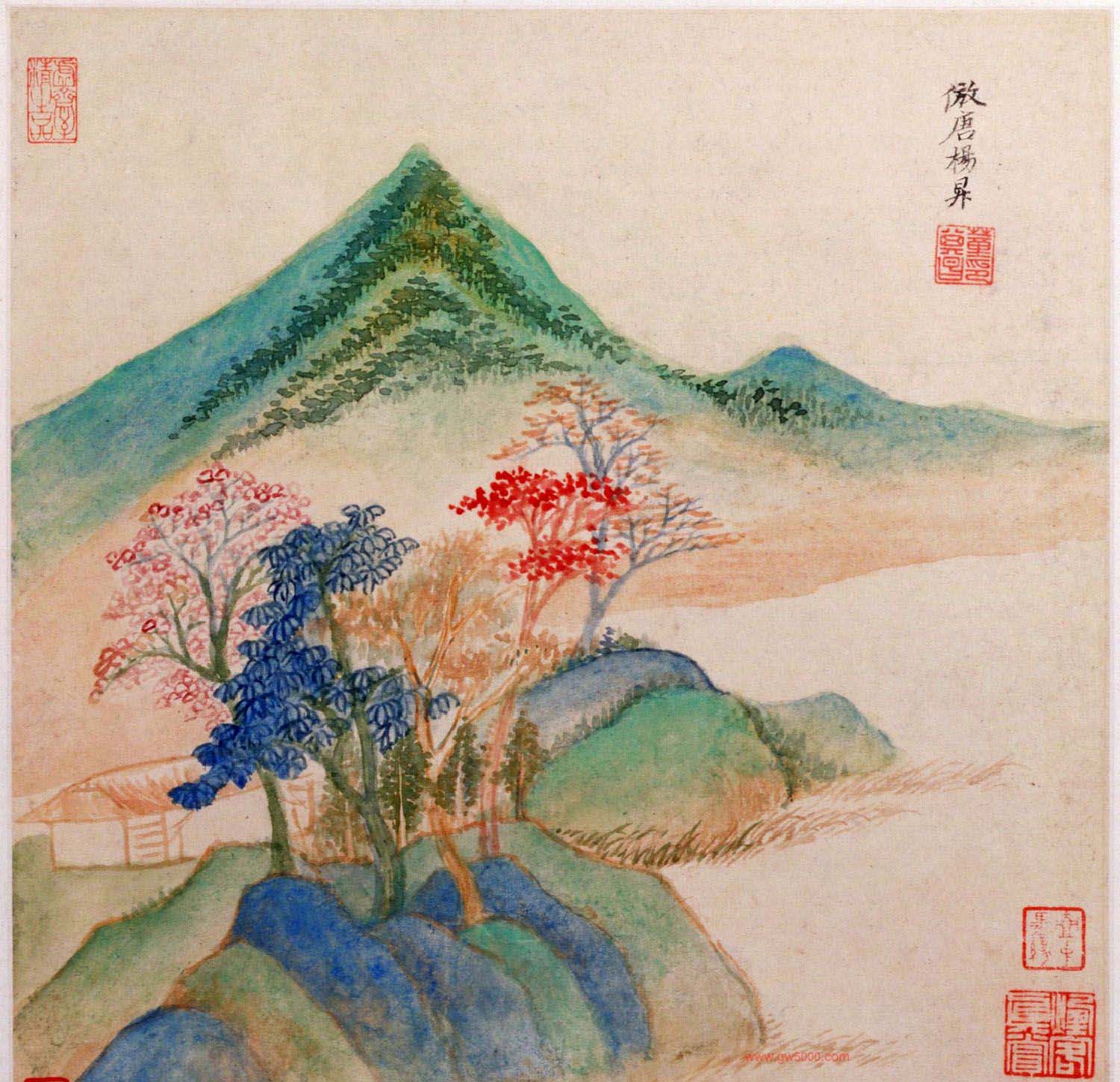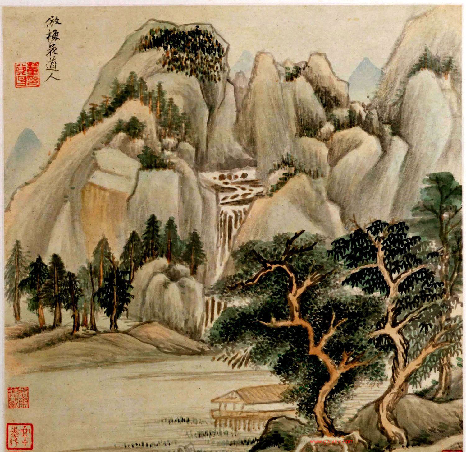 明代书画家董其昌字画欣赏《仿古山水》册,全册共八帧,纸本设色,单页纵26.3厘米,横25.5厘米,明天启元年(1621年),董其昌时年67岁作。北京故宫博物院藏。