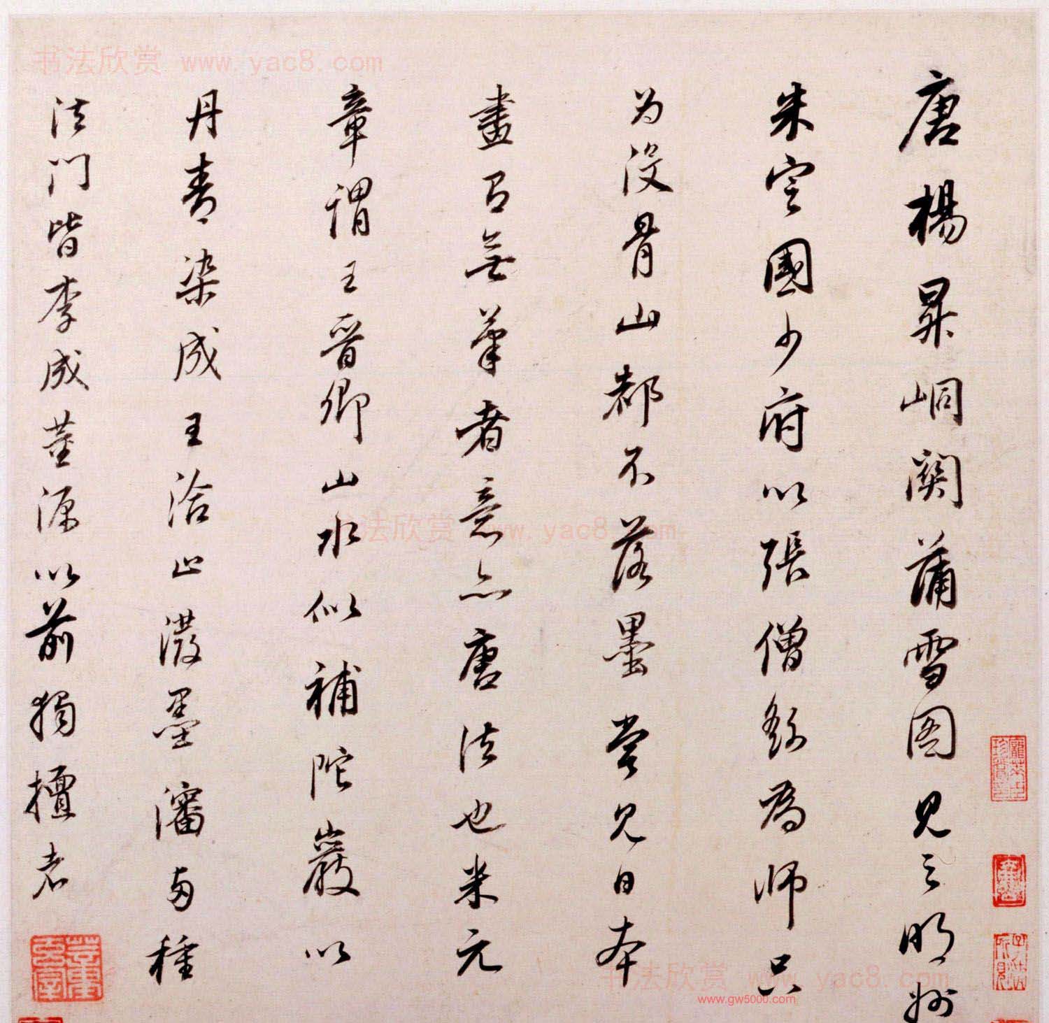 董其昌题:“唐杨昇峒关蒲雪图,见之明州朱定国少府,以张僧繇为师,只为没骨山,都不落墨。曾见日本画有无笔者,意亦唐法也。米元章谓王晋卿山水似补陀岩,以丹青染成。王洽正泼墨渖。多种法门皆李成、董源以前独善者。”
