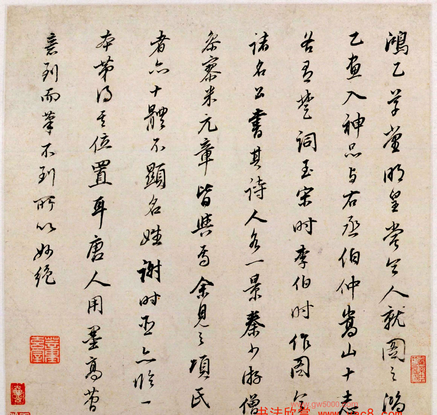董其昌题:“鸿乙草堂明皇尝令人就图之,鸿乙画入神品,与右丞伯仲。嵩山十志各有楚词。至宋时李伯时作图令诸名公书其诗,人各一景。秦少游、僧参寥、米元章皆与焉。余见之项氏者亦十体,不显名姓。谢时臣亦临一本,第得其位置耳。唐人用墨高简,意到而笔不到,所以妙绝。”