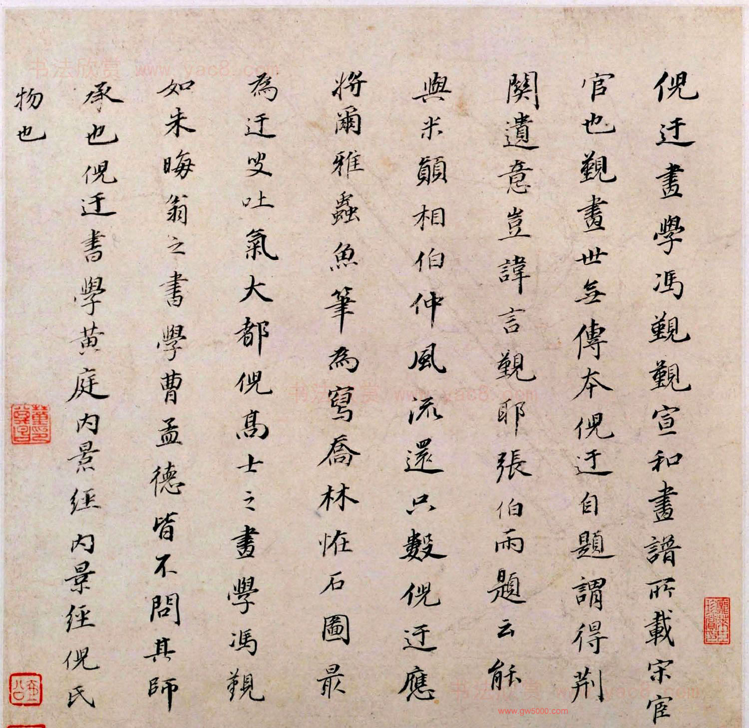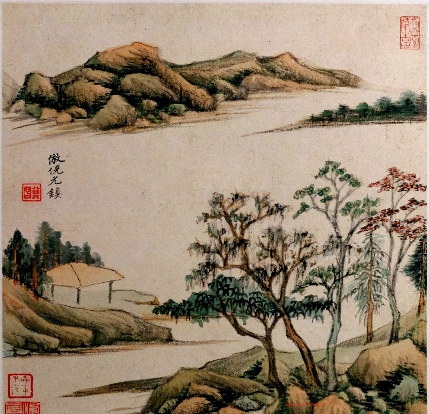 董其昌题:“倪迂画学冯觐。觐,《宣和画谱》所载宋宦官也。觐画世无传本。倪迂自题谓得荆关遗意,岂讳言觐耶?张伯两题云:‘能与米颠相伯仲,风流还只数倪迂。应将尔雅虫鱼笔,为写乔林恠石图。’最为迂叟吐气。大都倪高士之画学冯觐,如朱晦翁之书学曹孟德,皆不问其师承也。倪迂书学《黄庭内景经》,《内景经》倪氏之物也。”