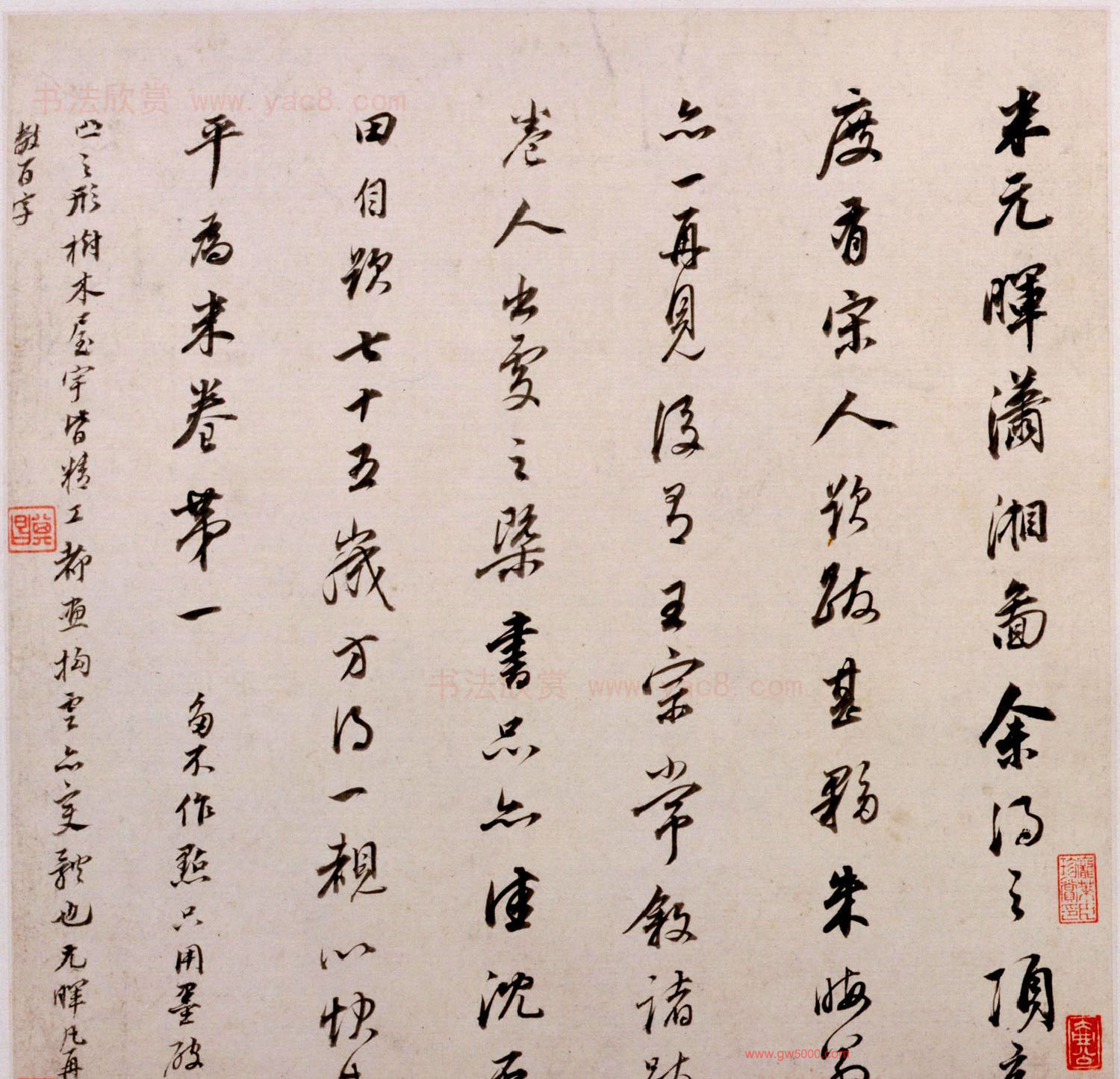 董其昌题:“米元晖潇湘图余得之项玄度,有宋人题跋甚夥。朱晦翁亦一再见。后有王宗常叙诸跋卷人出处之概,书品亦佳,沈石田自题七十五岁方得一观,以快生平,为米卷第一。图不作点,只用墨破凹凸之形,树木屋宇皆精工,都画勾云亦变体也。元晖凡再题数百字。”