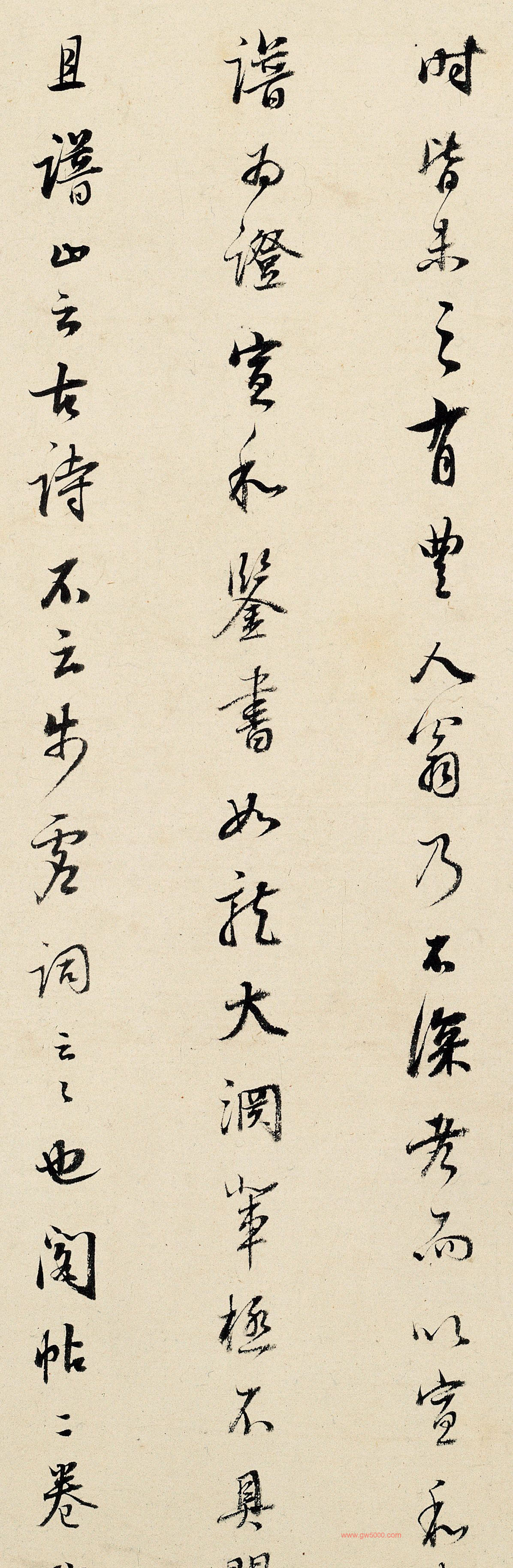 董其昌书法以行草书造诣最高,行书以“二王”为宗,又得力于颜真卿、米芾、杨凝式诸家,赵孟俯的书风也或多或少的影响到他的创作。草书植根于颜真卿《争座位》和《祭侄稿》,并有怀素的圆劲和米芾的跌宕。用笔精到,能始终保持正锋,作品中很少有偃笔、拙滞之笔;用墨也非常讲究,枯湿浓淡,尽得其妙;风格萧散自然,古雅平和。