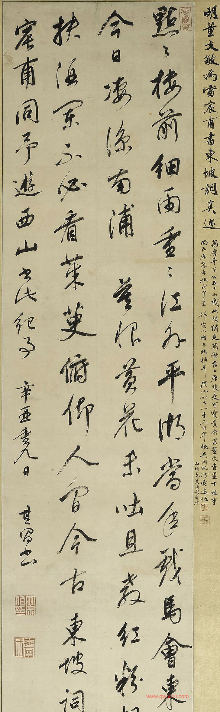 此幅为董其昌辛酉年(1621)所书苏东坡《西江月》词一首:“點點樓前細雨,重重江外平湖。當年戲馬會東徐,今日淒涼南浦。莫恨黃花未吐,且教紅粉相扶。酒闌不必看茱萸,俯仰人間今古”。
