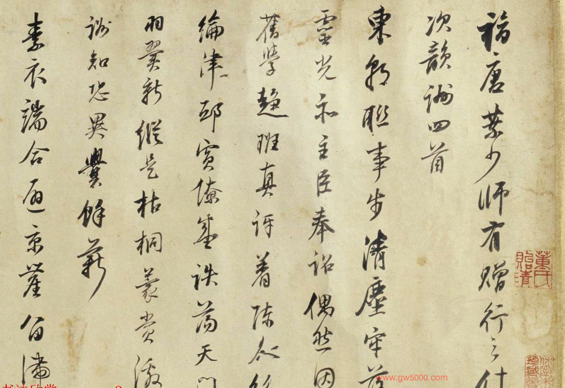 此卷所书内容包括福唐叶少师有赠行之什,次韵谢四首;录叶少师原作一首;叶君锡茂才,以诗赠行,复次前韵谢之一首;送侯六真侍御按黔二首;赠张蓬玄中丞自吏部郎出抚上如一首。诗中内容多是与同僚唱和之辞,借史言志,抒发政治抱负。此卷为小字行草书,一次抄录而成。行笔流畅秀逸,布局疏朗匀称,在博取古法的基础上自成一格,是董其昌晚年的用心之作。