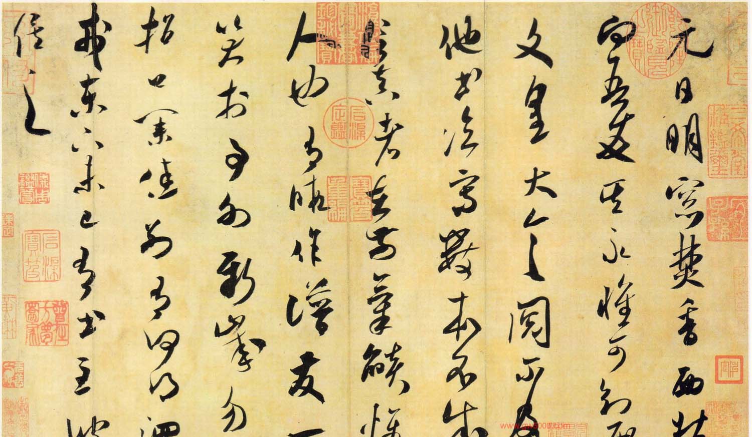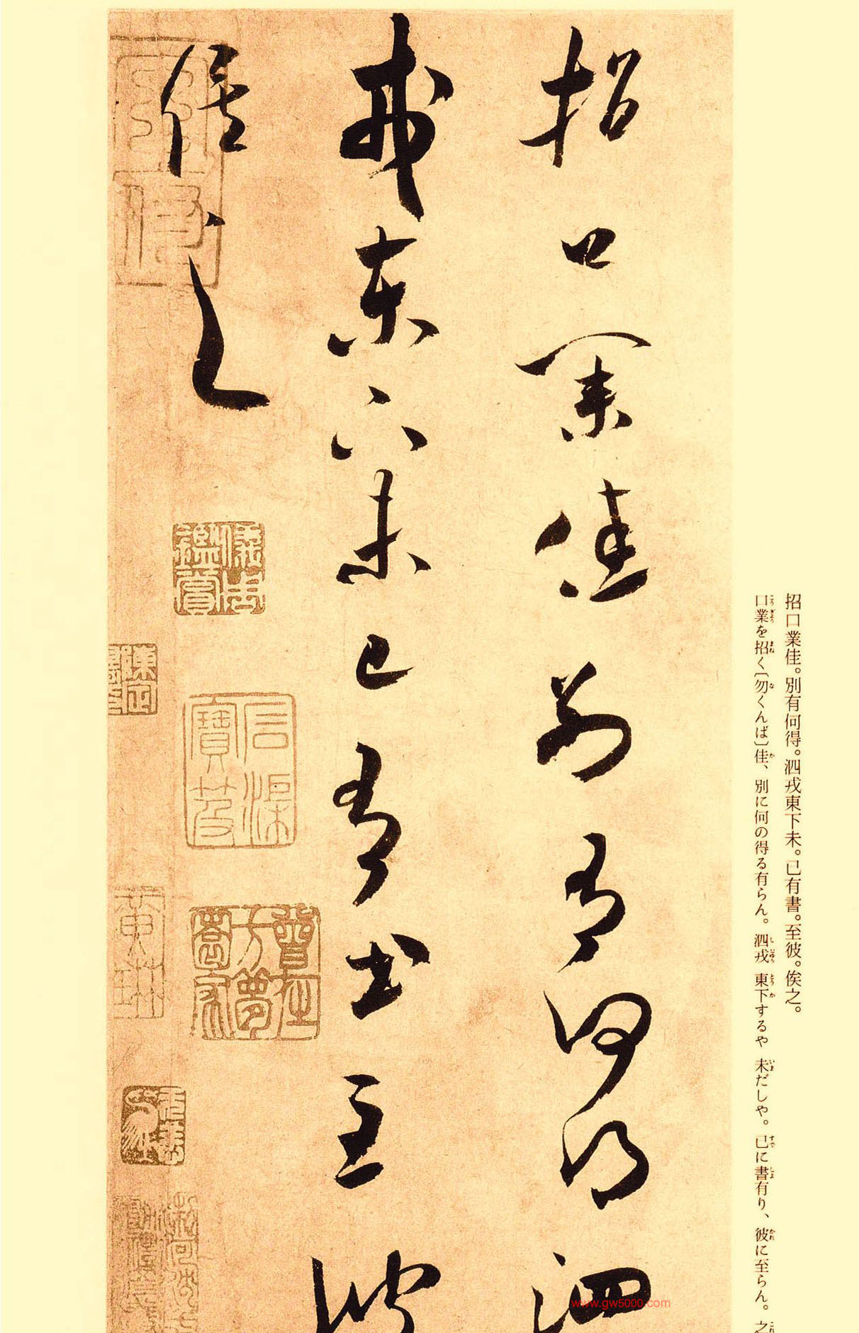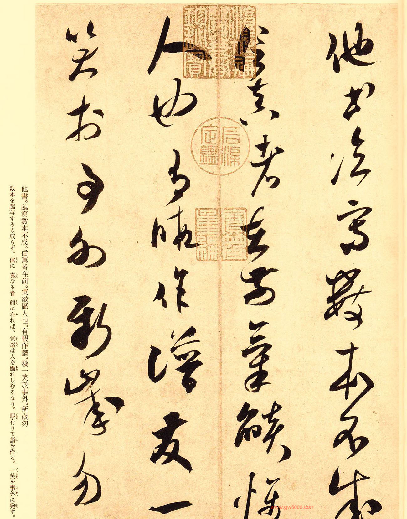 3.清吴升《大观录》:「笔势如风樯阵马,沉着痛快。而飞扬跌宕,亦时时间出。」