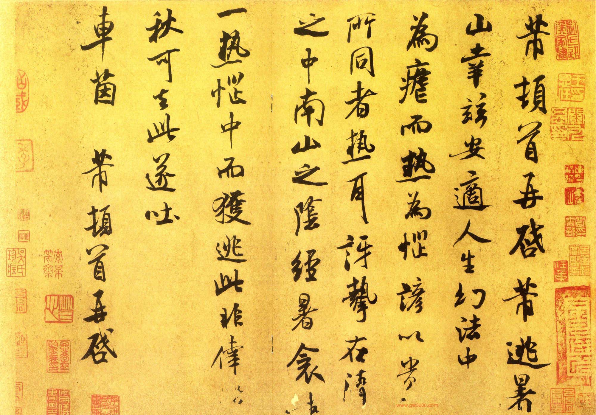 芾顿首再启。芾逃暑□山,幸兹安适。人生幻法中,□□为虐而热而恼。谚以贵□所同者热耳。讶挚在清□之中,南山之阴。经暑衿□一热恼中而获逃此,非幸□□。秋可去此,遂吐车茵。芾顿首再启。