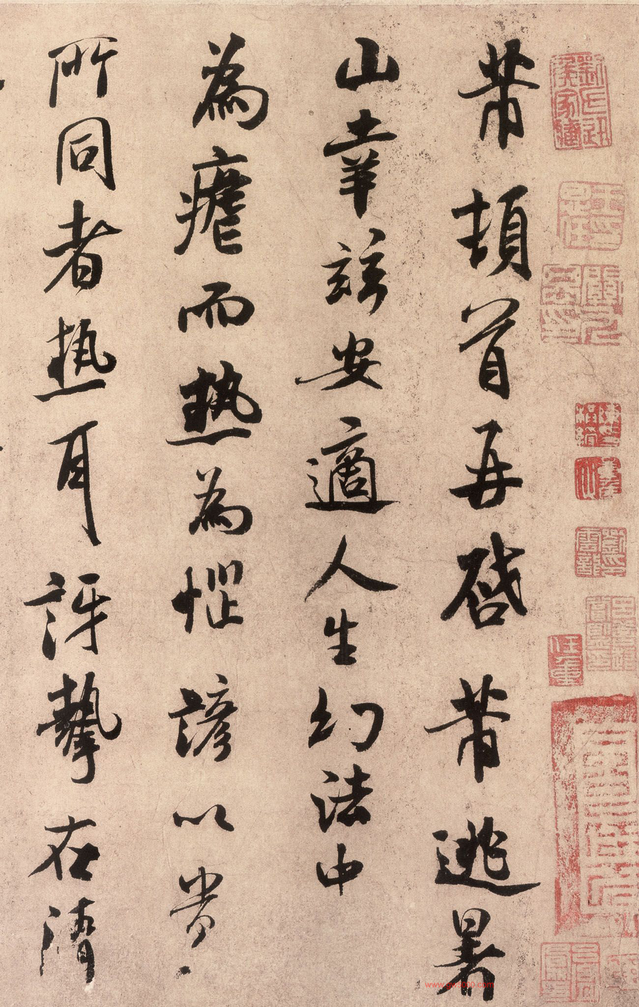 此帖笔法与米芾大观元年丁亥(1107)所书《无为章吉老墓志》、崇宁元年(1102)《褚河南临兰亭序跋》、崇宁二年(1103)所书《王略帖赞》较近;与米芾《蜀素帖》、《苕溪诗》(1088)、《乐兄帖》(1094)较之,老辣绝俗多了。老辣绝俗可归因于米芾此篇之作较稳重,从一些笔法可看出。首先米芾在此篇作品中少去了跳动的笔法,亦可说提按较不明显;再者速度略为缓和;用笔方面,最明显的是捺笔,如「逃」暑、安「适」、「之」中、「之」阴、「遂」。这些那笔看似有抖动的痕迹,不若前面几帖的干净爽利,但这样的抖动造成的是老辣的效果而非迟滞不前的滞笔。严格说来,这样的写法多了一种巧妙的韵致,一改一般人对米芾书法的看法。
