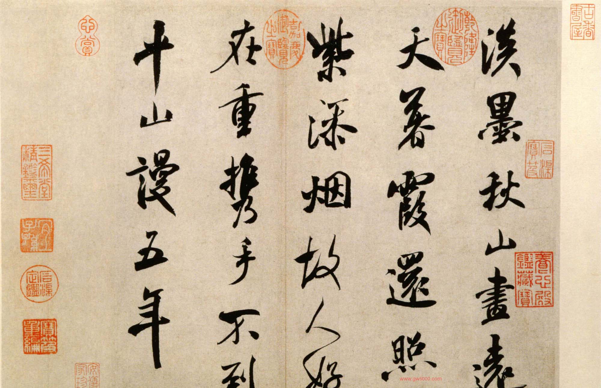 米芾行书欣赏《淡墨秋山诗帖》大图 纸本29.1X31.9cm 北京故宫博物院藏 图片尺寸:4189*2894 图片大小:1.8MB