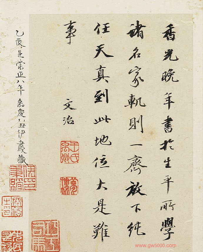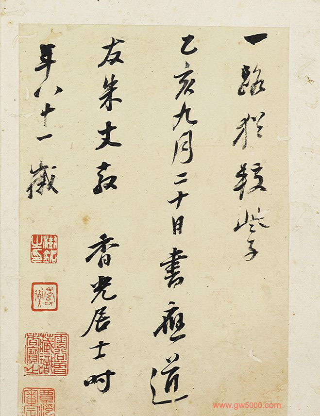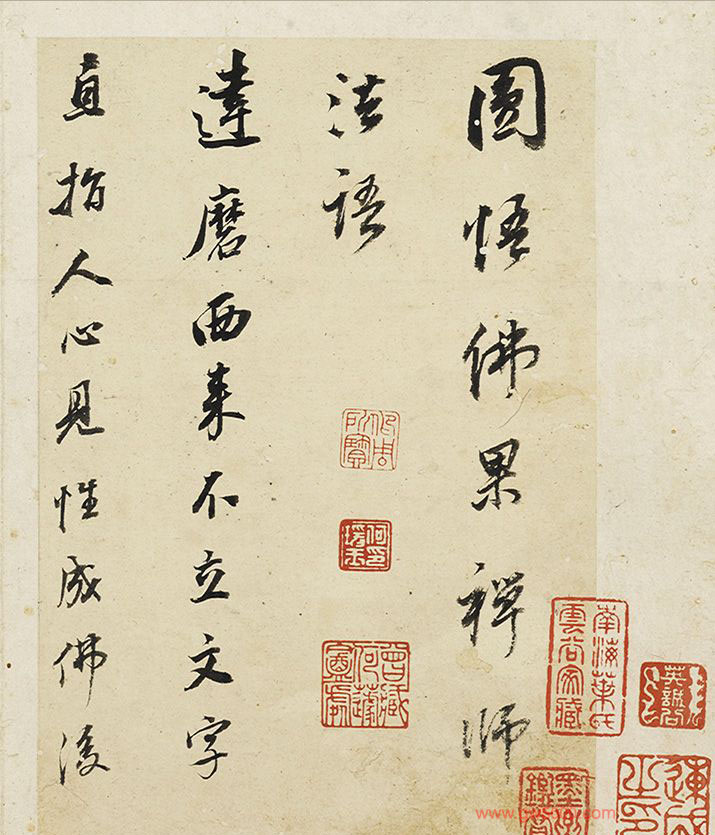 此册董氏81岁所书。圆悟克勤(1063-1135),宋高僧,俗姓骆,赐号“佛果禅师”,参黄檗、临济宗派。董氏自青年时即热衷禅学,于曹洞宗最为契合,又兼修净土宗,曾批阅永明《宗镜录》一百卷,大有奇悟。中进士后,日与陶望龄、袁宗道游戏禅悦。方外之交有莲池、紫柏、憨山等名流。董以禅论书画,遍参各家,解脱畦径。方燮跋云,董书开悟于米书,归宿于颜体:“磕着触着,无非平原妙处。”确为的语。