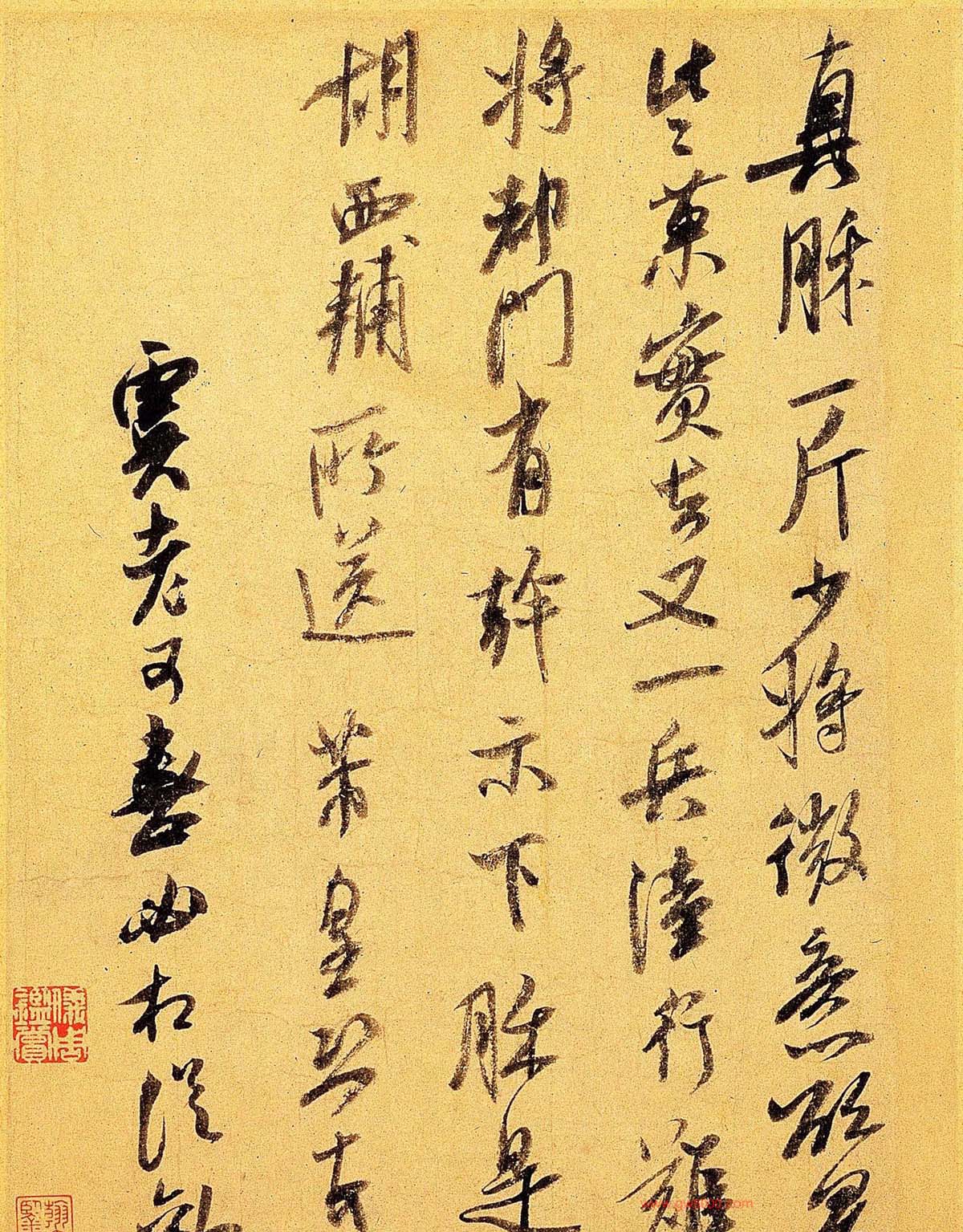 释文: 真一斤,少将微意,欲置 些果实去,又一兵陆行难 将。都门有干示下,是 胡西辅所送。芾皇恐顿首。 虞老可喜,必相从欢