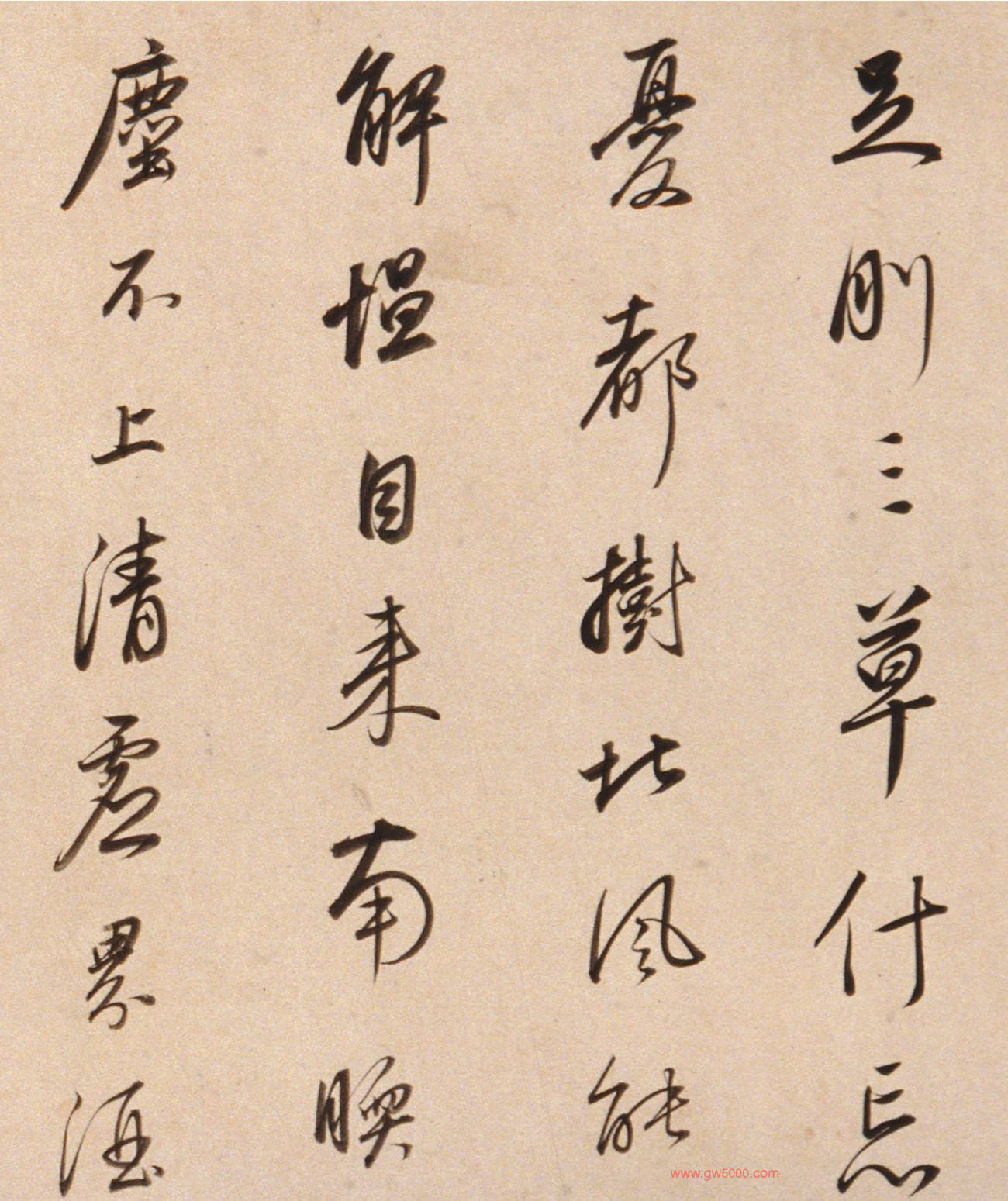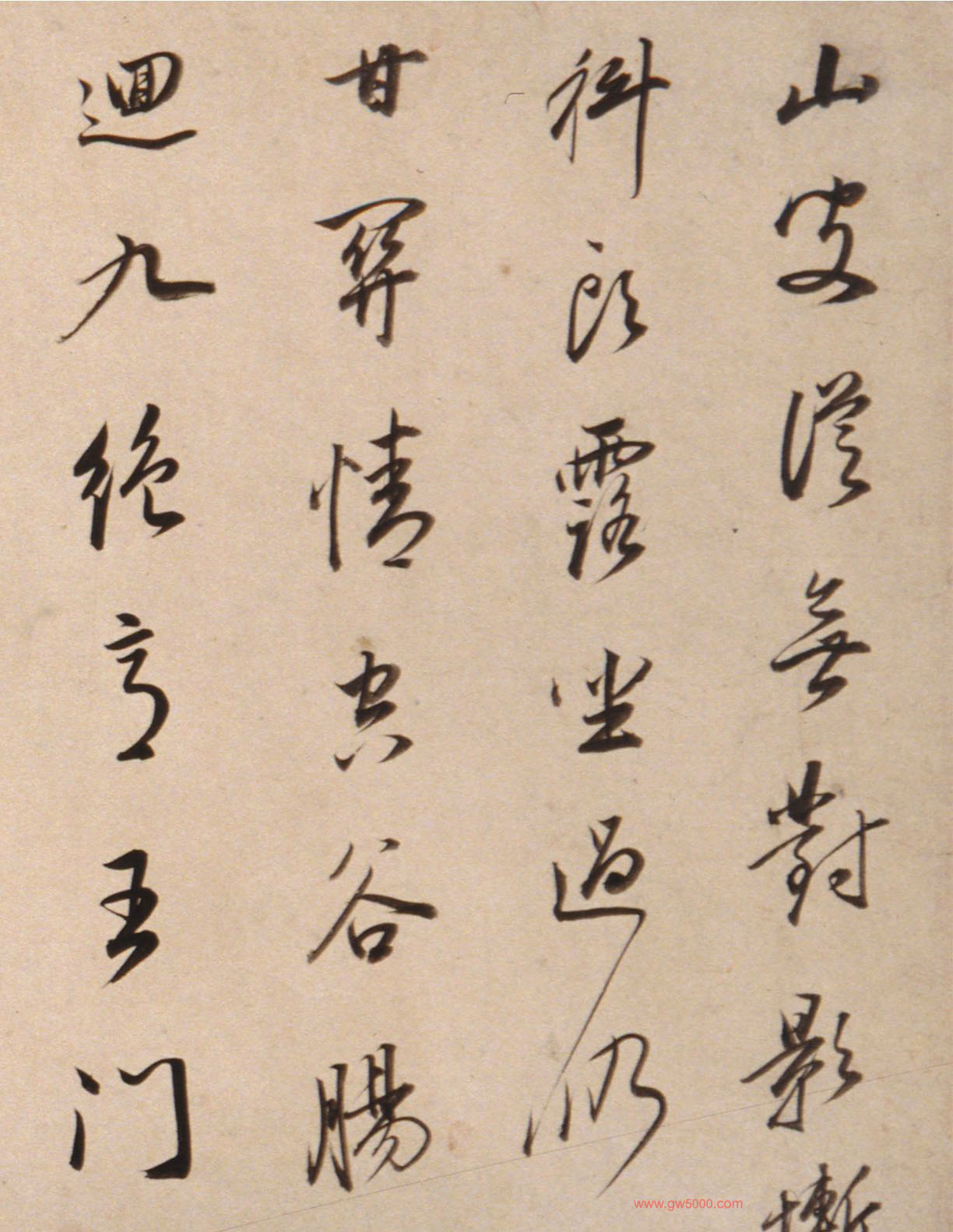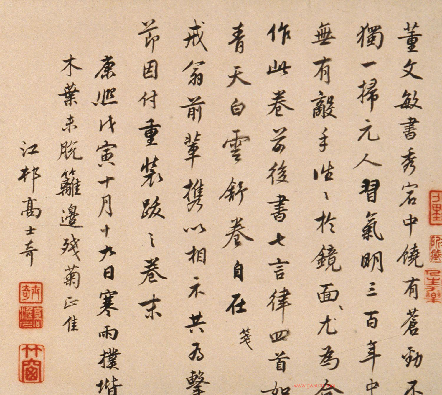 此卷分前后两段,共抄七言律诗四首,并收于《容台诗集》,题为《赠陈仲醇征君东佘山居诗三十首》。这组诗用同一韵部,虽然数量庞大,但是诗意并不重复。基本都是描述陈继儒的隐居生活,体现了董其昌与陈继儒的深厚友谊。此卷书于1619年,董氏65岁。所用纸张光洁坚实,应为董氏经常提及的镜面笺。故而用笔圆润,墨色清润,展现了董氏中年研习二王行草书的成就。
