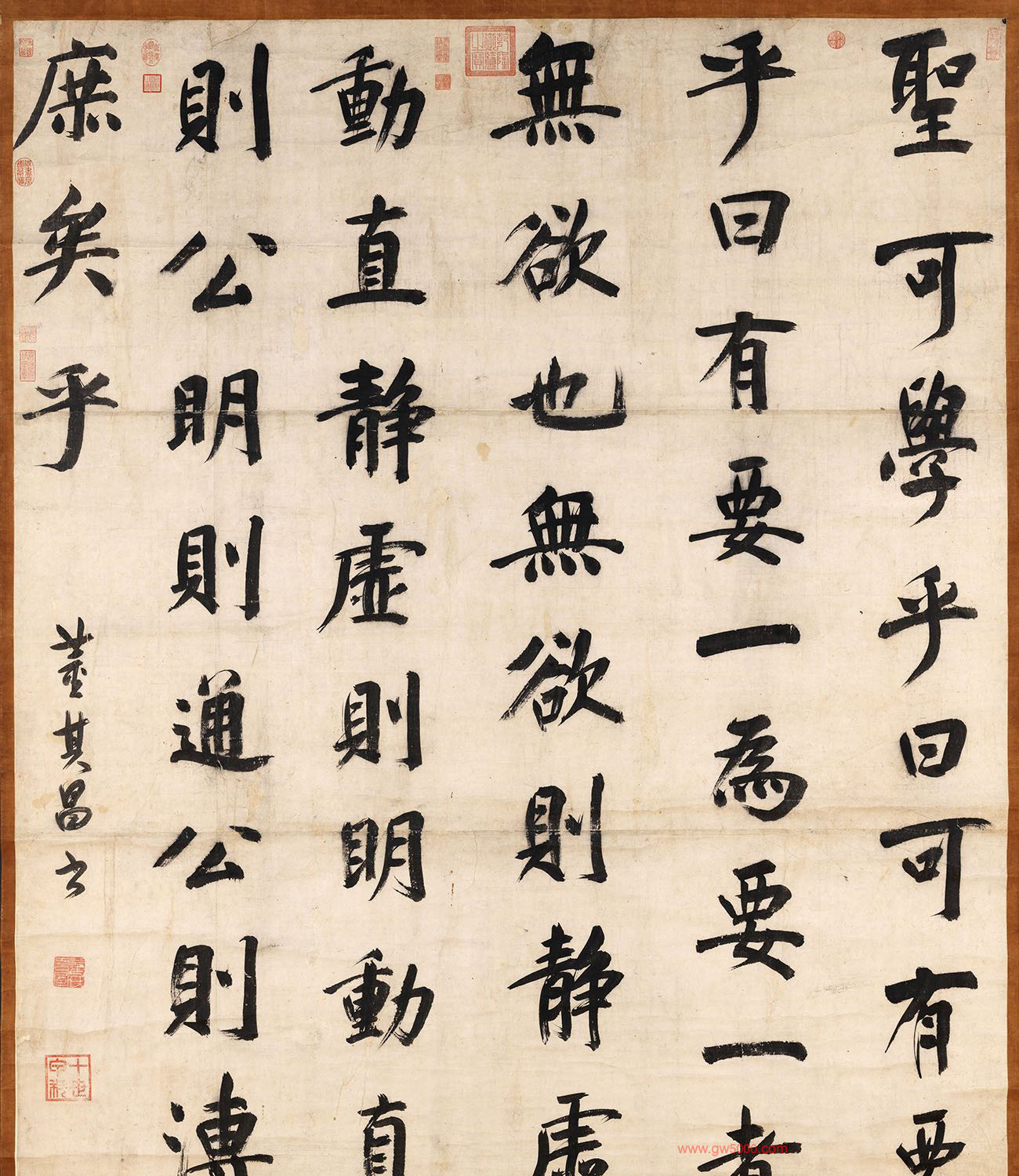 此軸約作於1611年,書周敦頤語,論人如何學以至聖。通篇揉合歐陽詢、顏真卿的楷書風格,線條圓厚,字形端正而略顯修長。濃墨與飛白的對比表現出提按的韻律感,並使人感到筆法的灑脫與豪邁。
