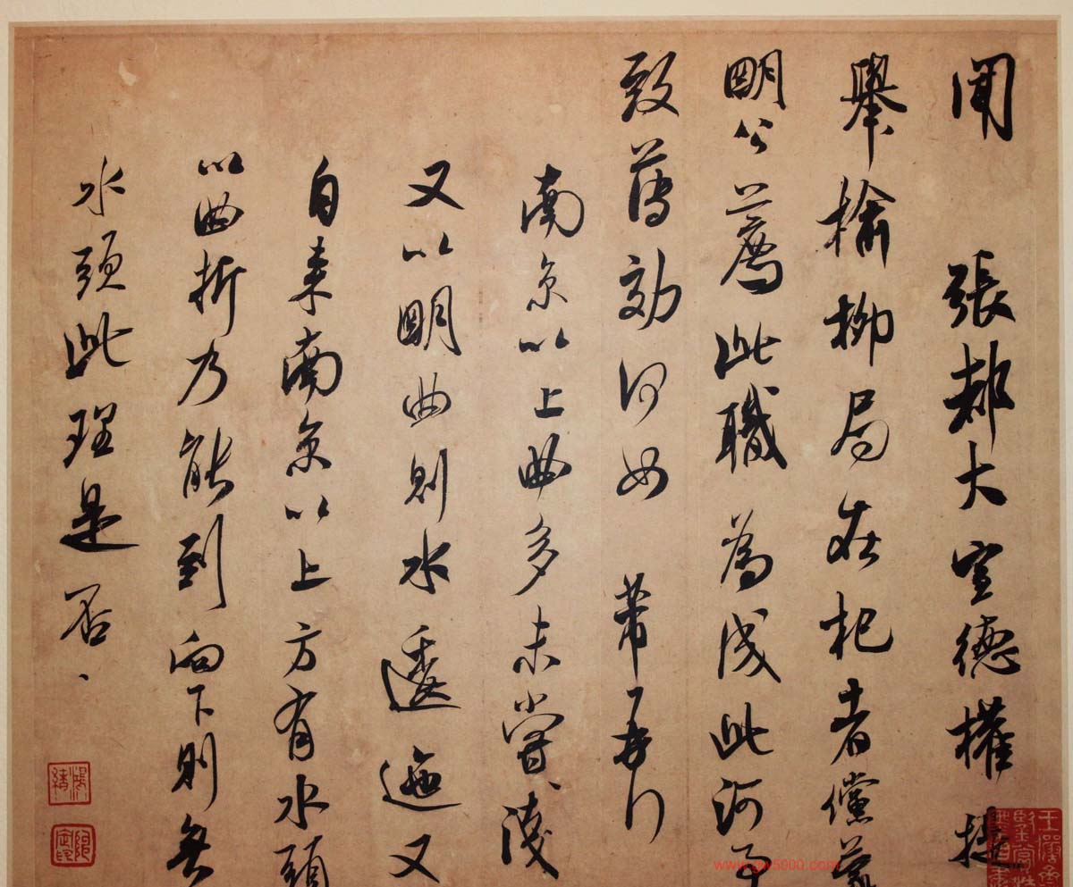 米芾行草书欣赏《闻张都大宣德尺牍》,又称《河事帖》 纸本。纵29.4厘米 横33.8厘米,台北故宫博物院藏。 图片像素:2133*1886 图片大小:0.574MB 释文: 闻张都大宣德,权提 举榆柳局在杞者。傥蒙 明公荐此职,为成此河事 致薄效何如。芾再拜。 南京以上曲多未尝浅, 又以明曲则水逶迤。又 自来南京以上方有水头, 以曲折乃能到。向下则无 水头。此理是否。