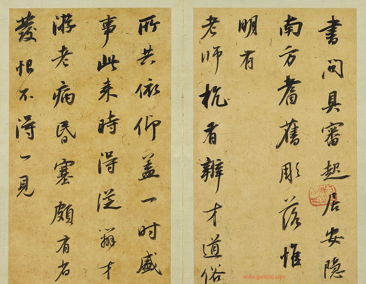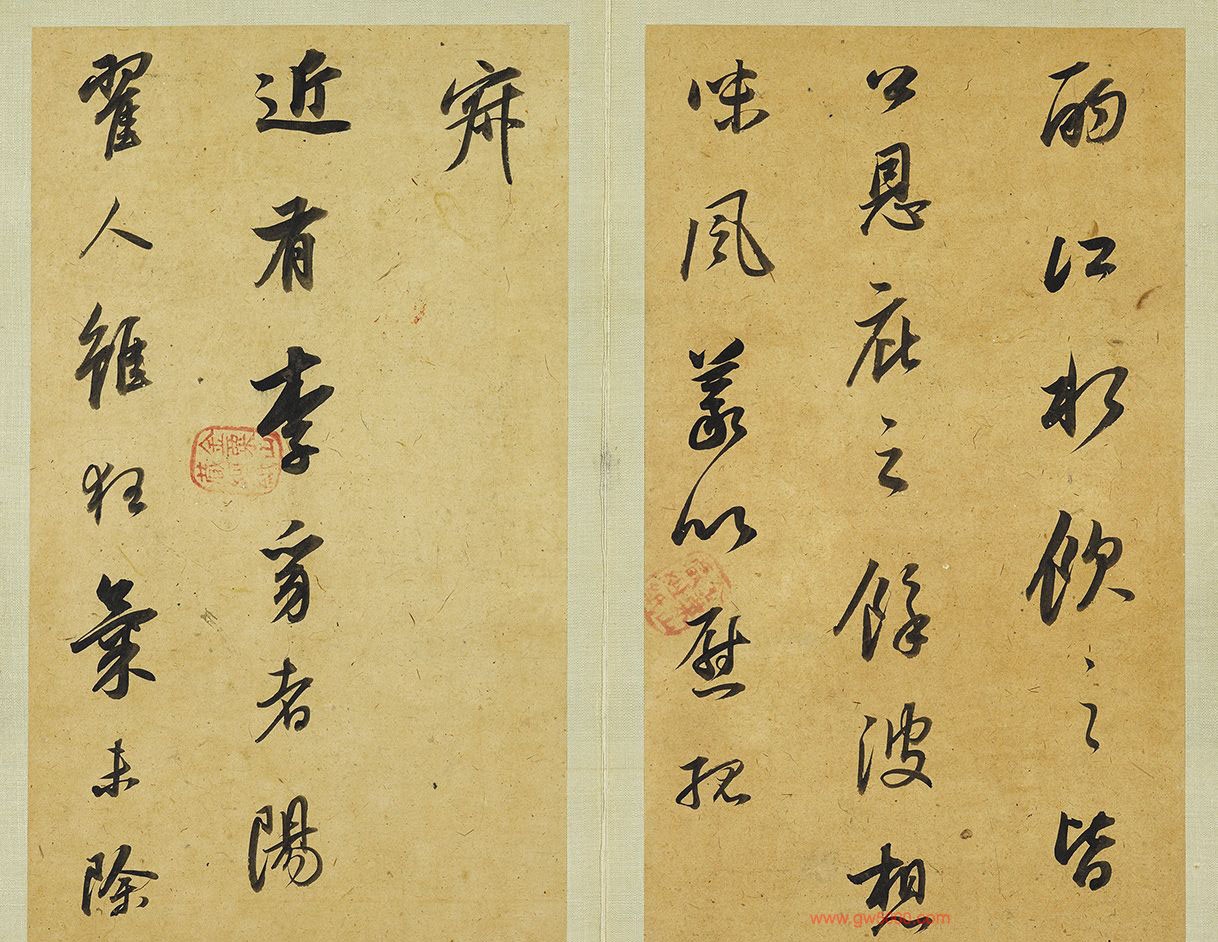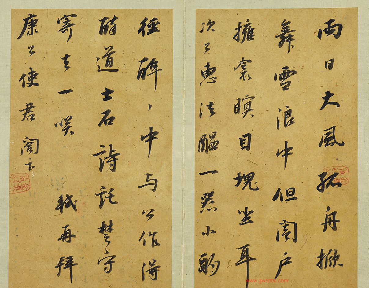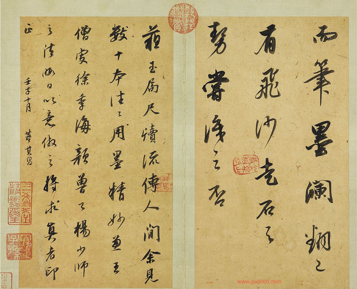 本册为董氏节录苏轼尺牍七段,阮元《石渠随笔》曾载此册,记为六段,又收入《石渠宝笈续编》。金粟笺本,笔精墨妙。有脱漏或改动字句处。1612年,董文敏58岁,其时于深研二王基础上,董氏进而汲取宋四家之长,除米芾外,钻研最深的便是苏轼。董书以灵动绰约见长,虽不如苏书沉厚雄健,然圆润秀逸则过之。