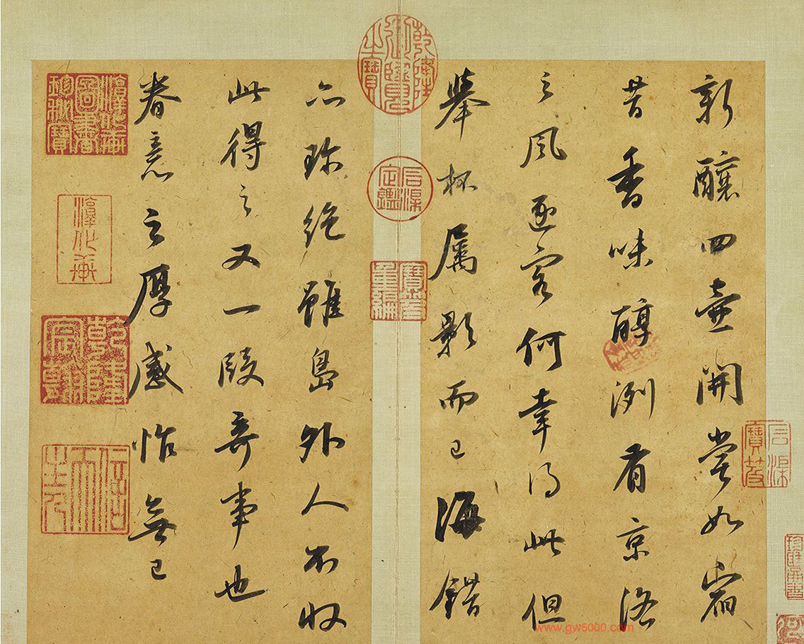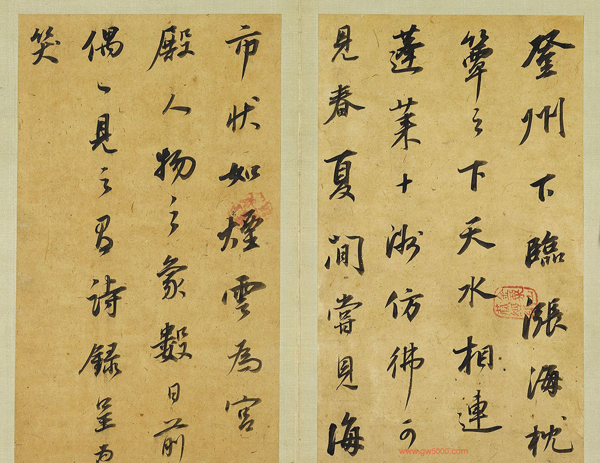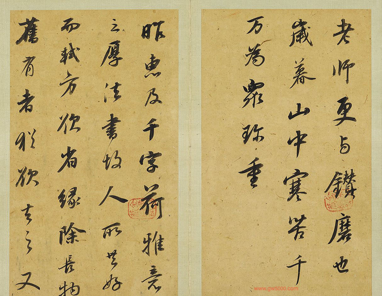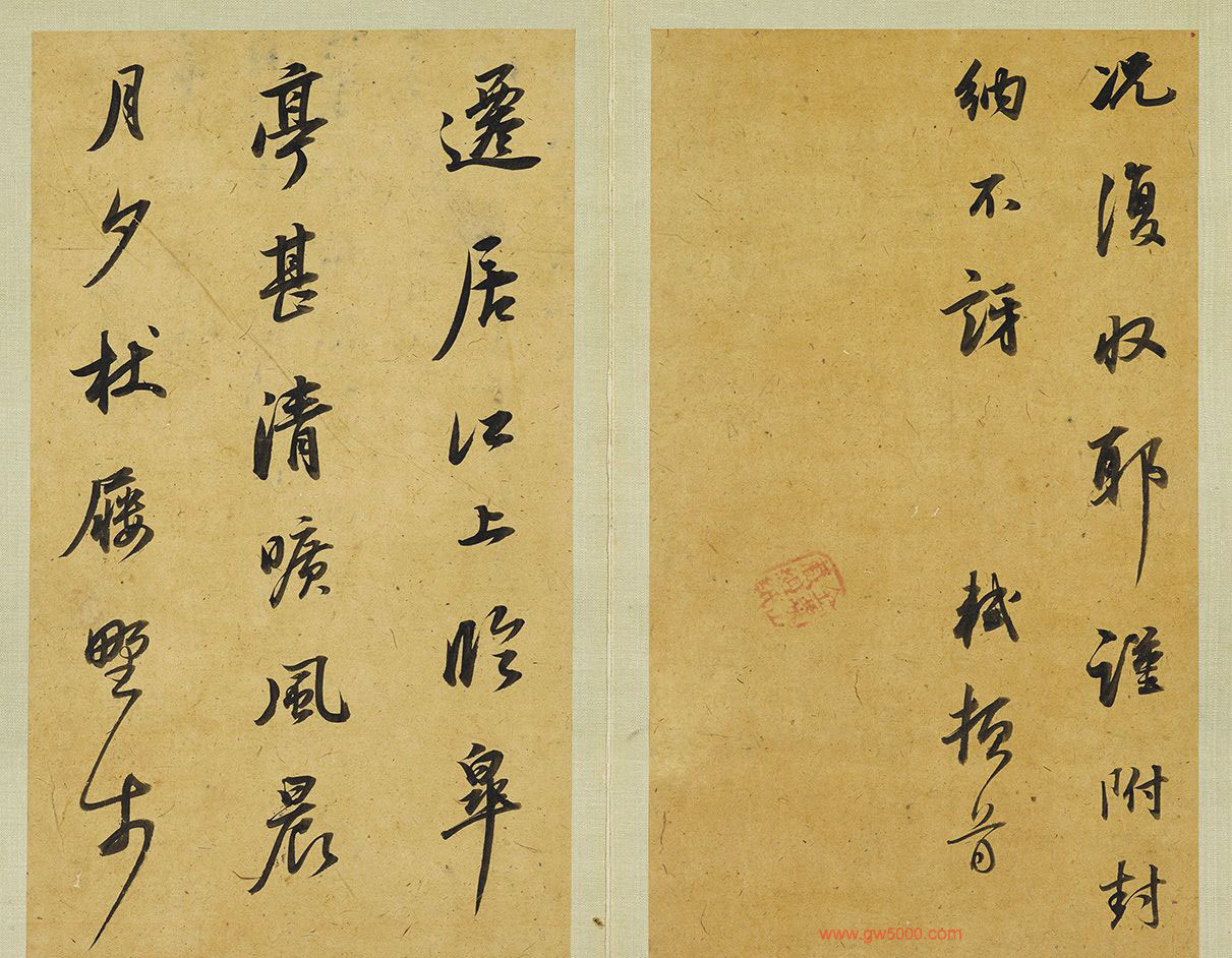 本册为董氏节录苏轼尺牍七段,阮元《石渠随笔》曾载此册,记为六段,又收入《石渠宝笈续编》。金粟笺本,笔精墨妙。有脱漏或改动字句处。1612年,董文敏58岁,其时于深研二王基础上,董氏进而汲取宋四家之长,除米芾外,钻研最深的便是苏轼。董书以灵动绰约见长,虽不如苏书沉厚雄健,然圆润秀逸则过之。