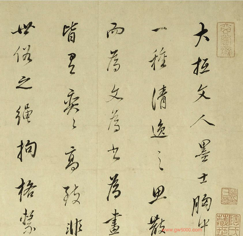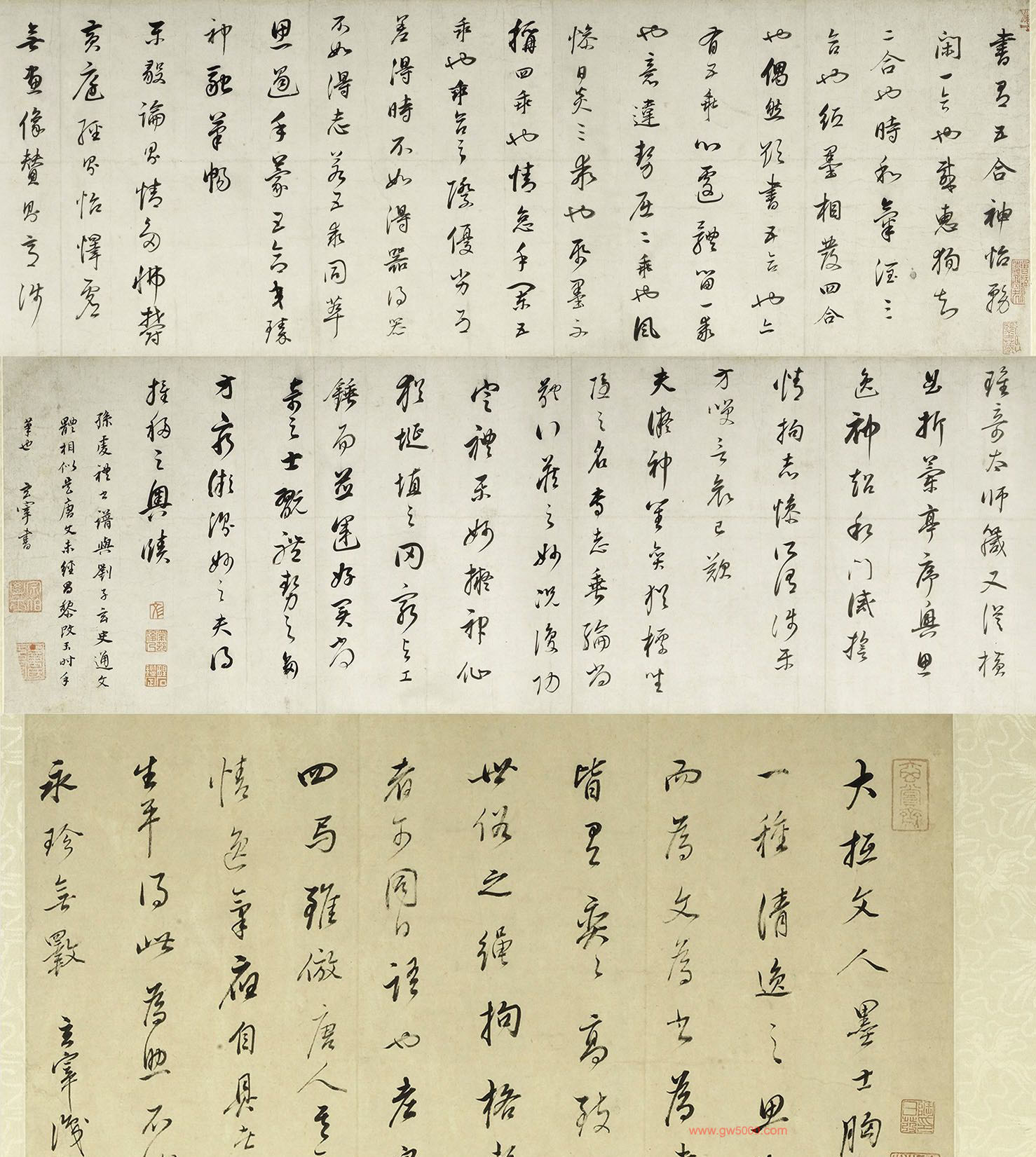此卷虽仿孙过庭,而二王风神之秀逸、颜书骨格之盎然。所用砑纸光洁细腻,用笔凝炼遒劲,丝毫毕现,神完气聚。此卷分成两部分,前为行书节录《书谱》,后为论画一则,应系后人集装。钤“宗伯学士”印,应是1623年董氏69岁擢礼部右侍郎后所作。董氏终生临古,涉猎广泛,以二王、颜真卿对其行书影响最大。在中晚年成熟期,尽管兼容并蓄各大家,但在字里行间流露的仍是王书、颜体家数。