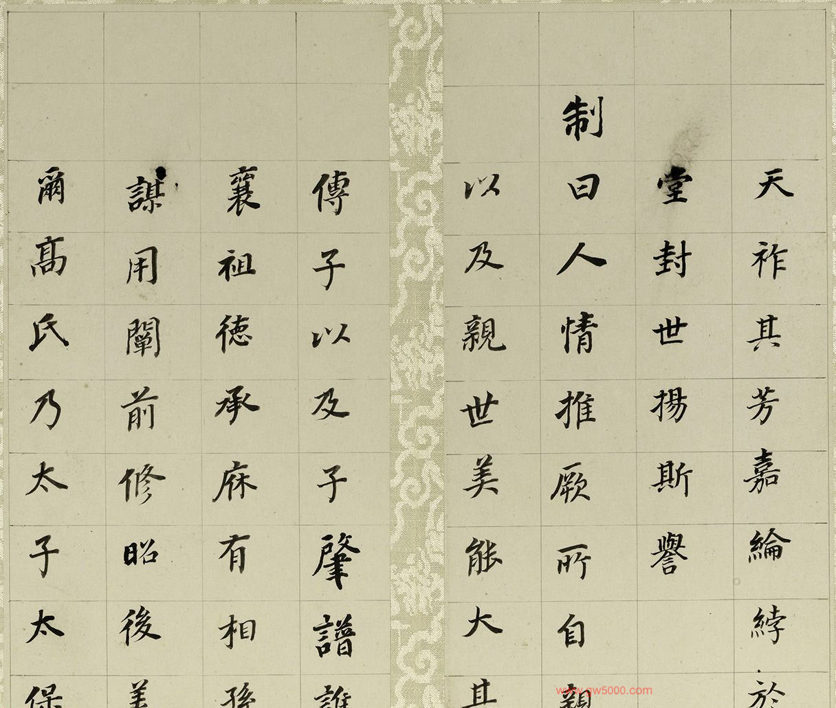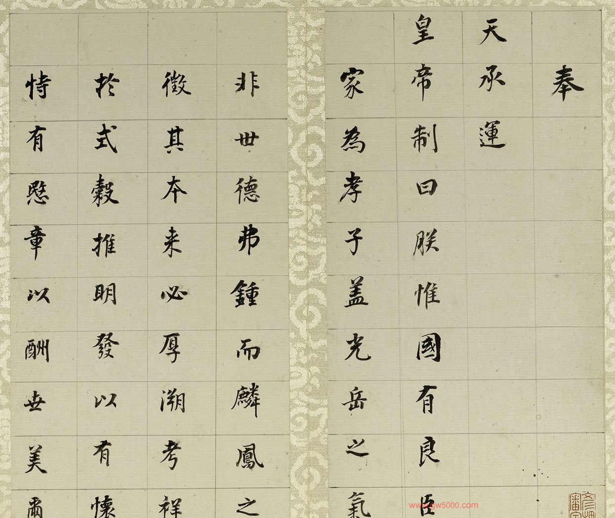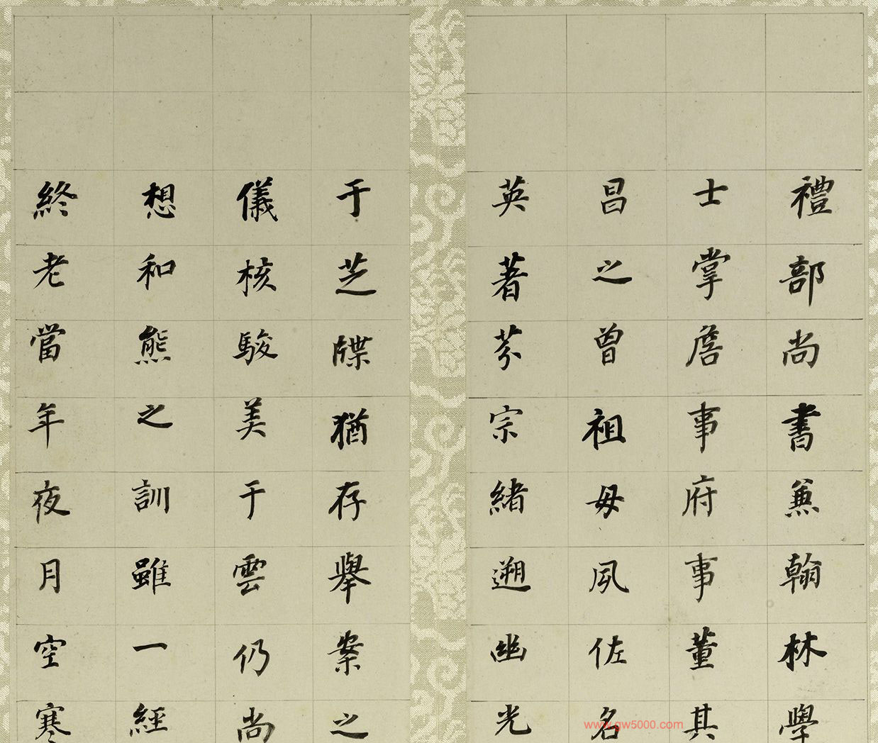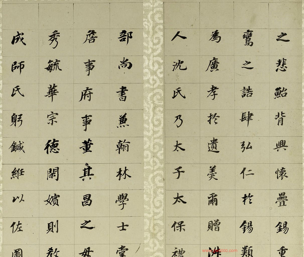 本册董其昌抄录朝廷所颁先世诰身,乌丝栏界格。册前为曾祖父董华、曾祖母高氏告身。册后为父董汉儒、母沈氏告身。无款识钤印。结体端庄,用笔沉稳,是其融汇颜书的佳构。通篇神凝气聚,天真烂漫,当系80岁左右书。潘奕隽题跋赞道:“余见文敏书不下千余本,而小楷不易不觏,此书先世告身尤为用意之作,精深华妙,原本钟太傅,洵有观止之叹。”