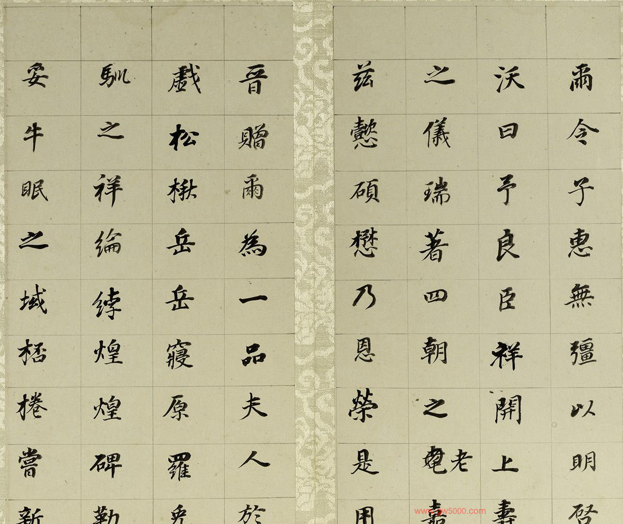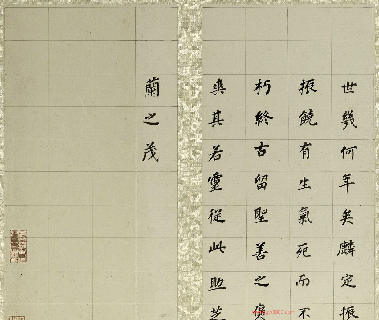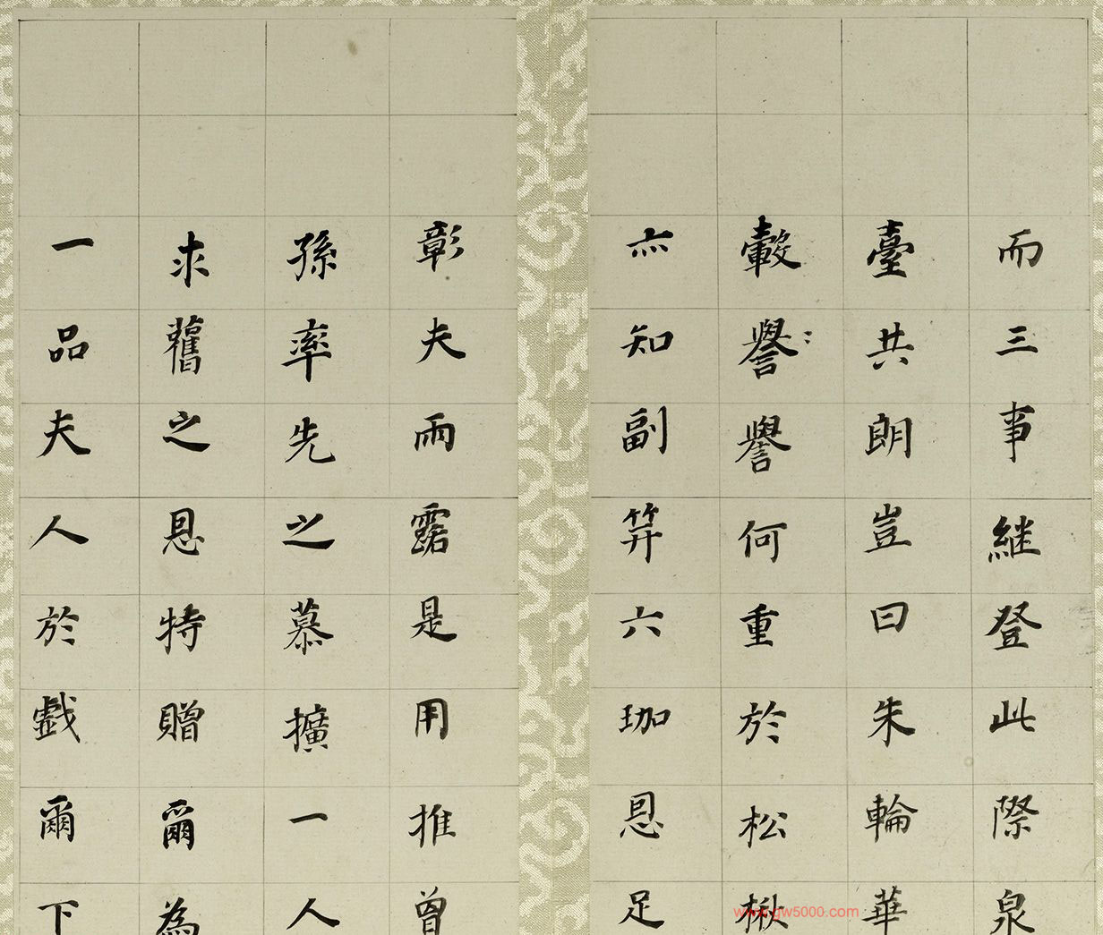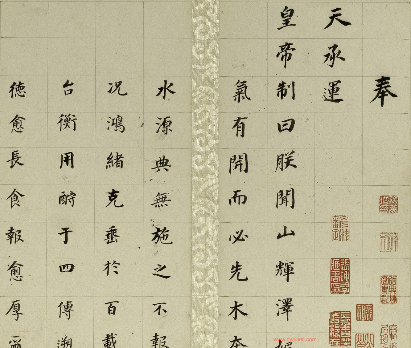 本册董其昌抄录朝廷所颁先世诰身,乌丝栏界格。册前为曾祖父董华、曾祖母高氏告身。册后为父董汉儒、母沈氏告身。无款识钤印。结体端庄,用笔沉稳,是其融汇颜书的佳构。通篇神凝气聚,天真烂漫,当系80岁左右书。潘奕隽题跋赞道:“余见文敏书不下千余本,而小楷不易不觏,此书先世告身尤为用意之作,精深华妙,原本钟太傅,洵有观止之叹。”