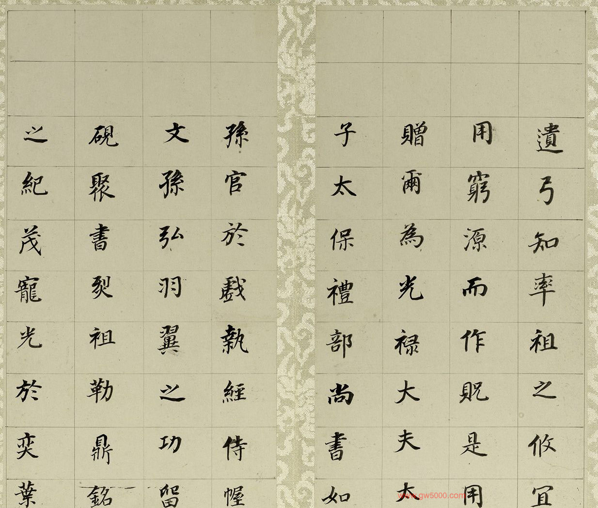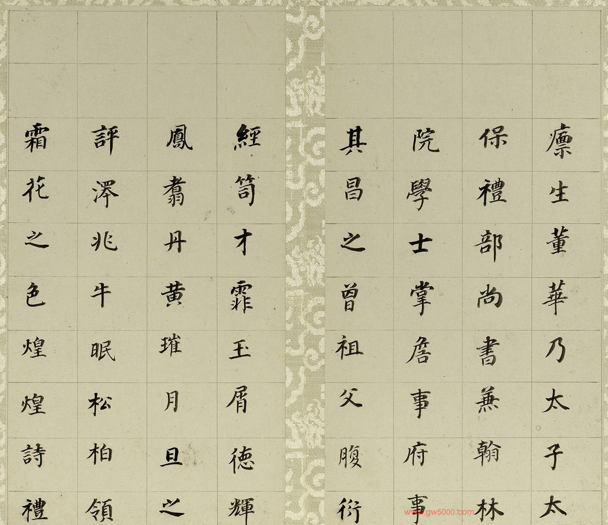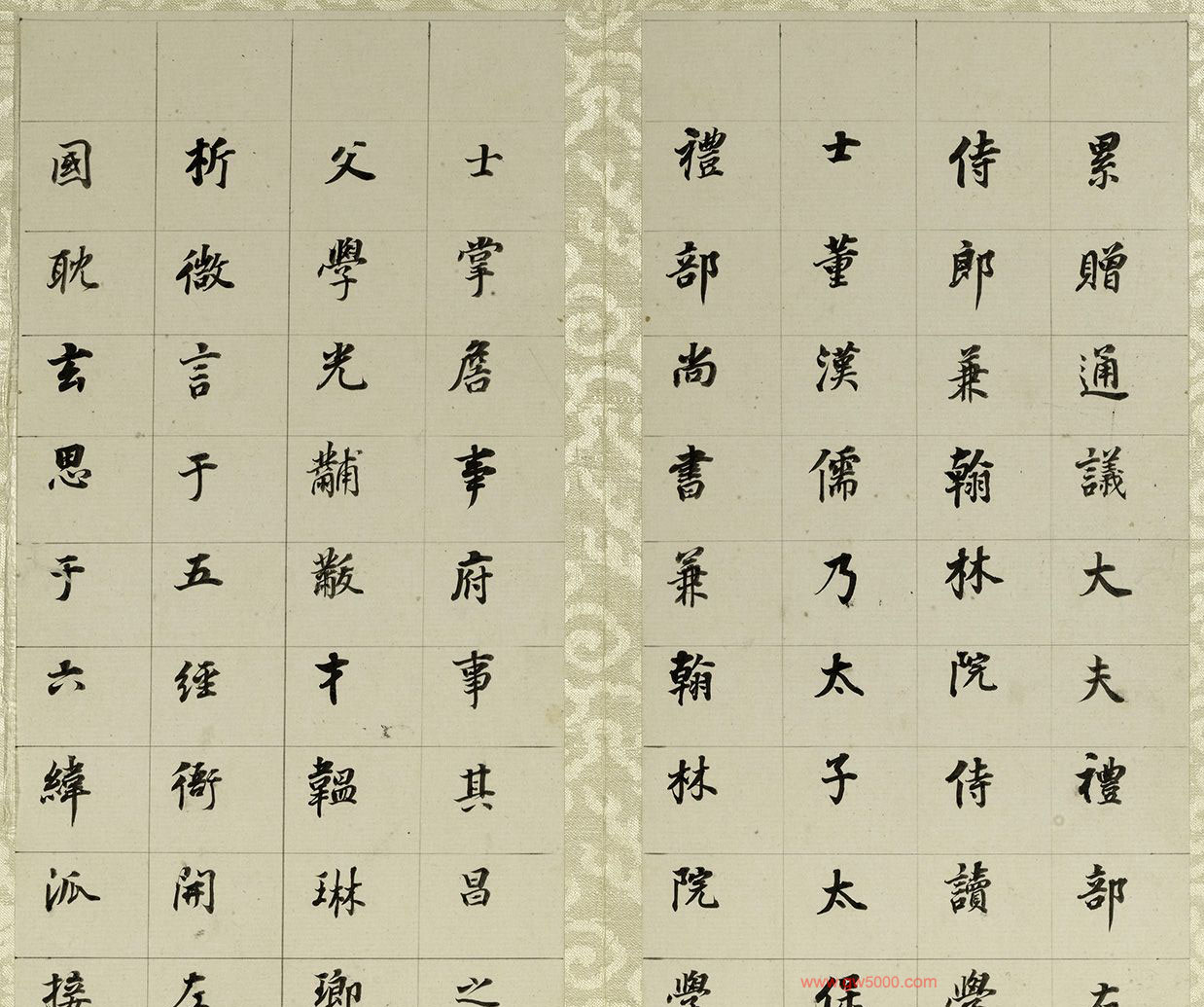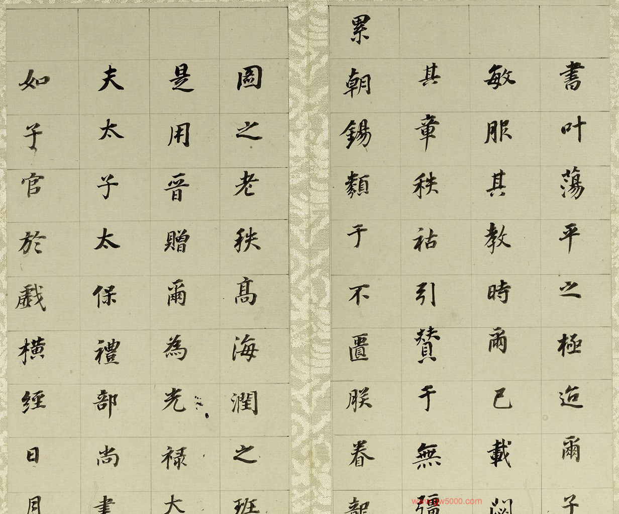 本册董其昌抄录朝廷所颁先世诰身,乌丝栏界格。册前为曾祖父董华、曾祖母高氏告身。册后为父董汉儒、母沈氏告身。无款识钤印。结体端庄,用笔沉稳,是其融汇颜书的佳构。通篇神凝气聚,天真烂漫,当系80岁左右书。潘奕隽题跋赞道:“余见文敏书不下千余本,而小楷不易不觏,此书先世告身尤为用意之作,精深华妙,原本钟太傅,洵有观止之叹。”