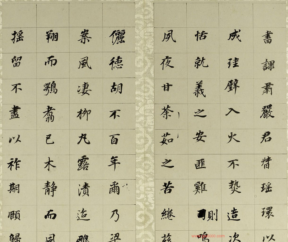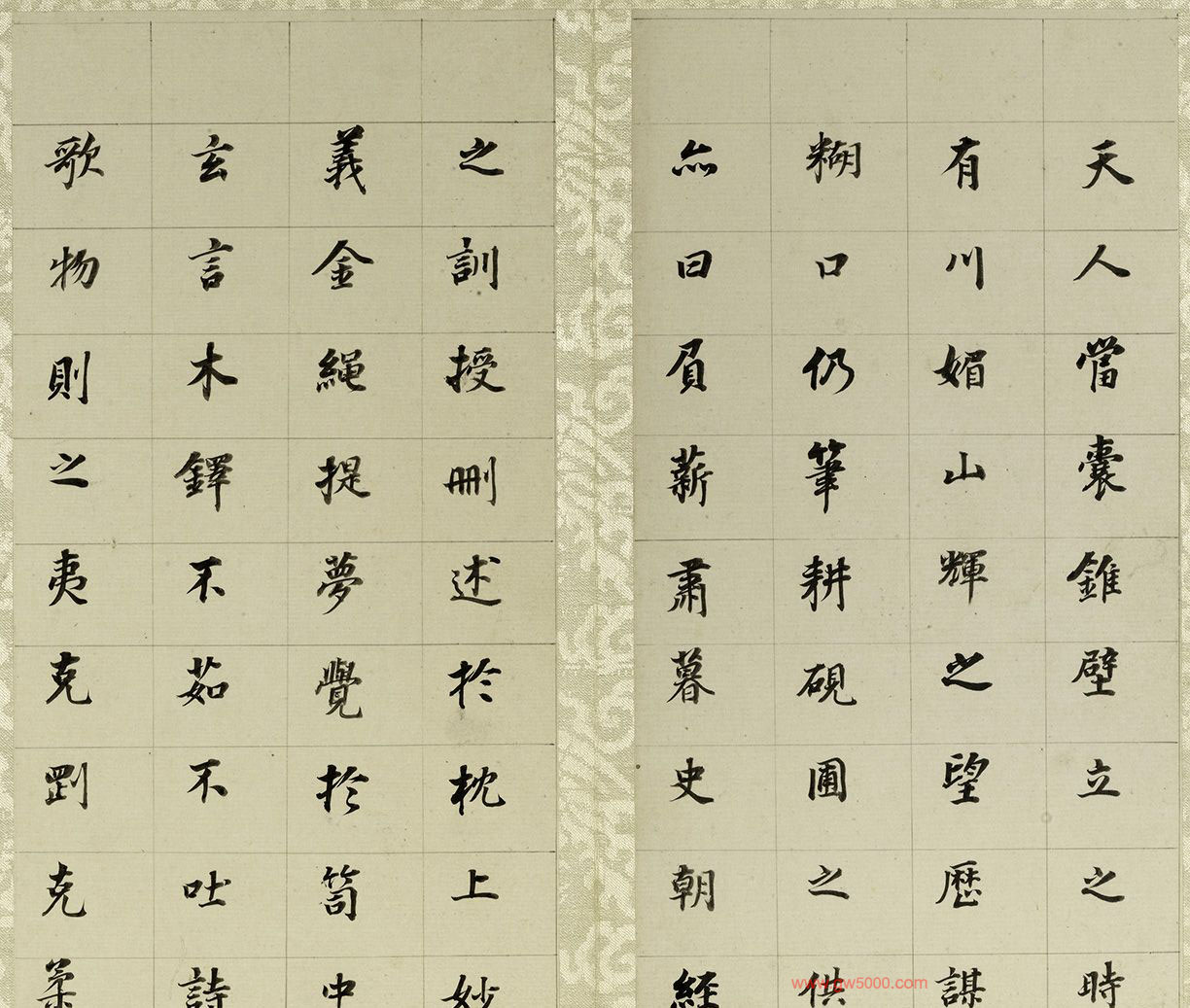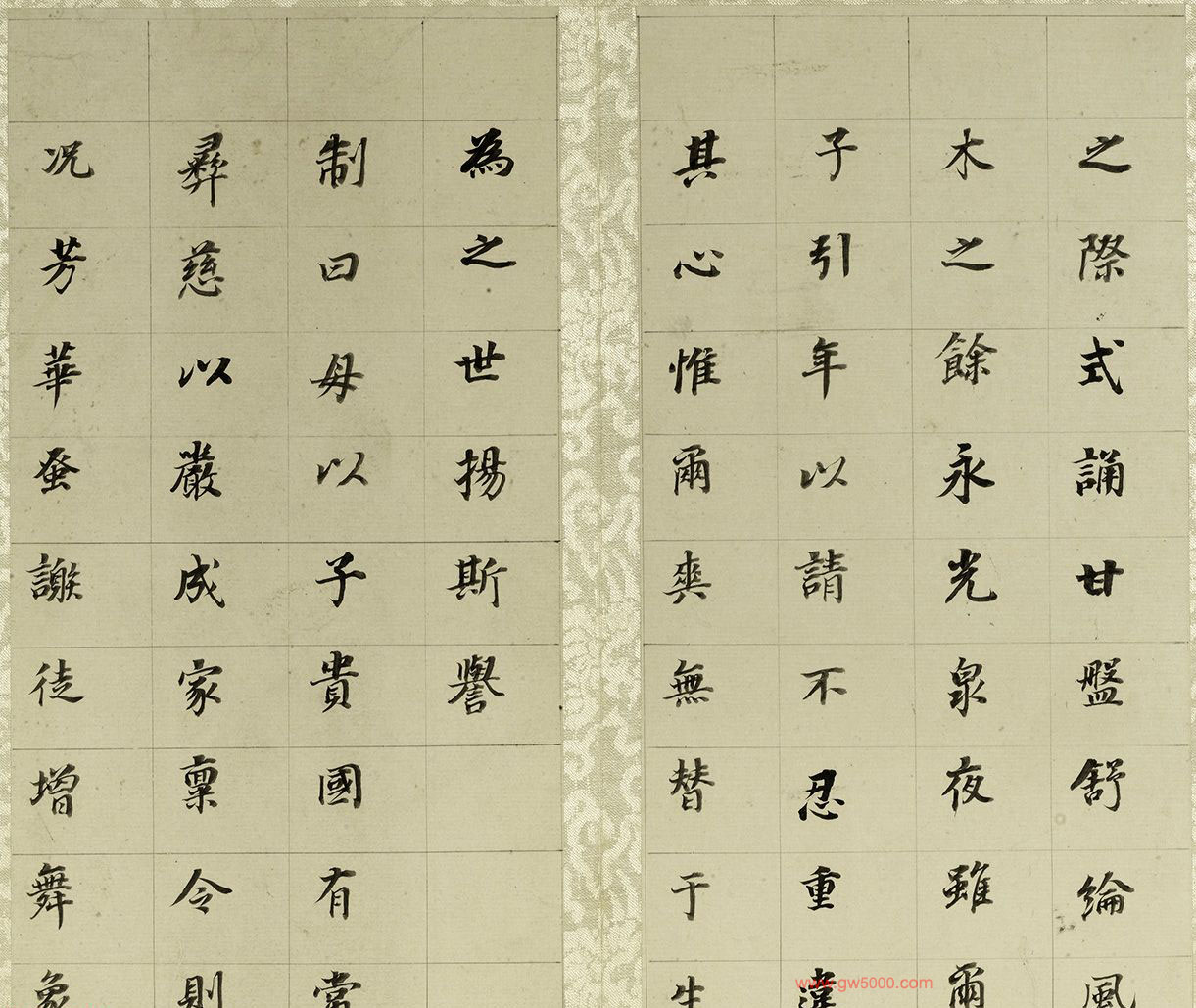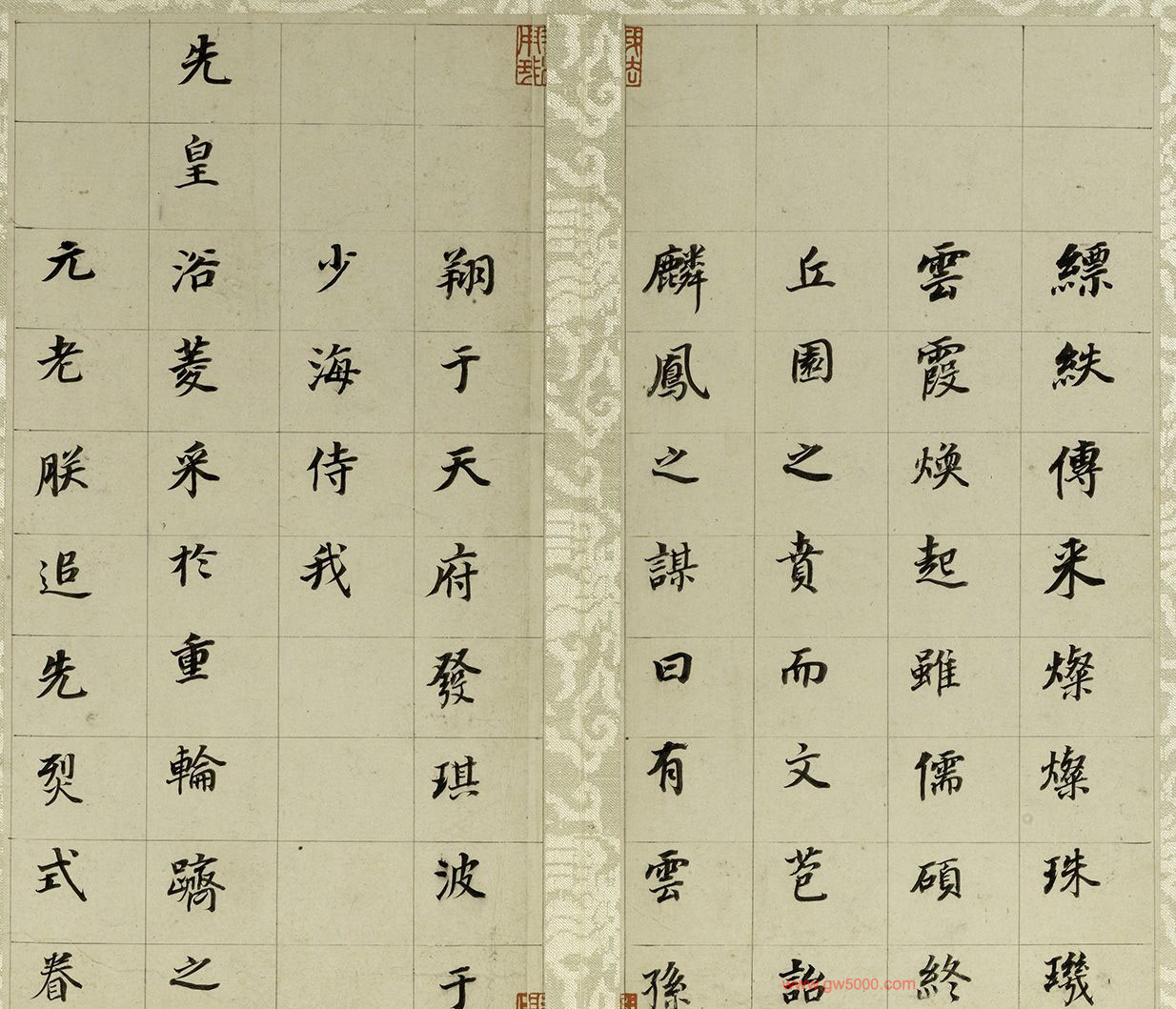 本册董其昌抄录朝廷所颁先世诰身,乌丝栏界格。册前为曾祖父董华、曾祖母高氏告身。册后为父董汉儒、母沈氏告身。无款识钤印。结体端庄,用笔沉稳,是其融汇颜书的佳构。通篇神凝气聚,天真烂漫,当系80岁左右书。潘奕隽题跋赞道:“余见文敏书不下千余本,而小楷不易不觏,此书先世告身尤为用意之作,精深华妙,原本钟太傅,洵有观止之叹。”