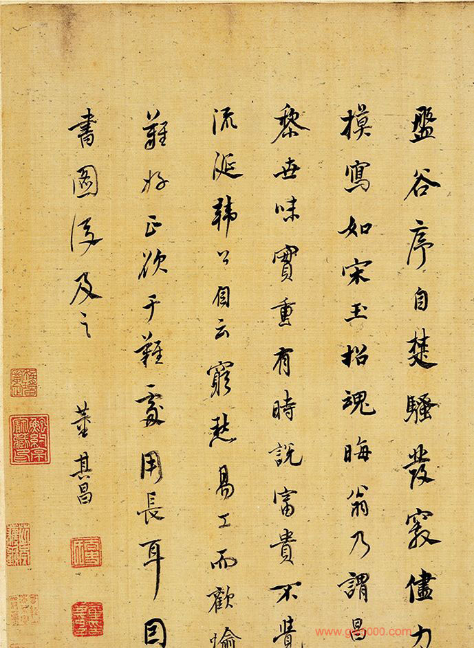 本卷借唐韩愈《送李愿归盘谷序》之意,描绘文人归里隐居理想之景。董其昌行草书,笔力劲爽跳宕,已深受米芾书法影响。