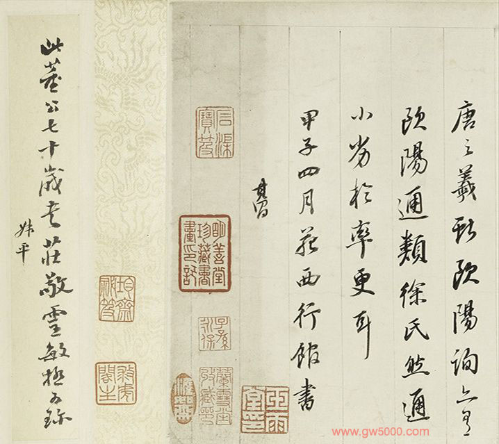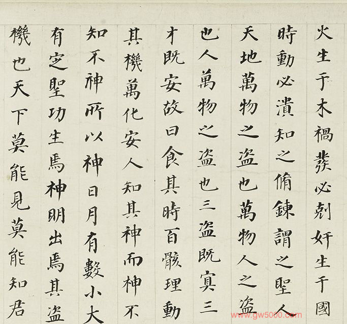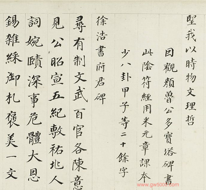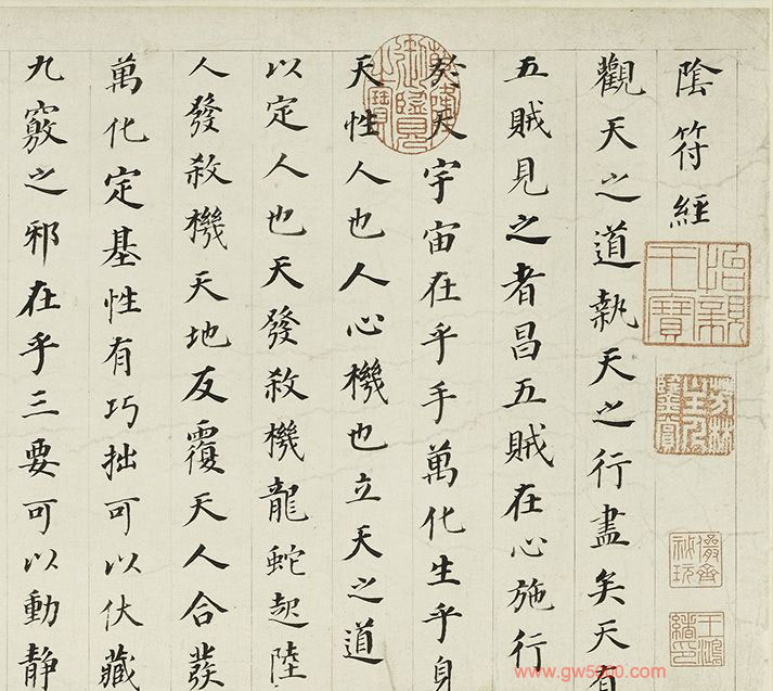 本卷前半节书《阴符经》。董氏观赏颜真卿《多宝塔碑》有感,遂以其笔意临米芾《阴符经》,然米书少了结尾“八卦甲子”等二十余字,董氏字数则更少。后半临徐浩《府君碑》,董氏定此碑出自李邕、徐浩自书,并将欧阳询、欧阳通,及徐峤之、徐浩喻为“唐之羲、献”。徐浩与颜真卿为盛唐丰满刚劲书风的代表。1624年,董氏70岁,其楷从娴熟渐返生拙,有人书俱老之趣。光洁的镜面笺,滋润生秀,纤毫毕现。