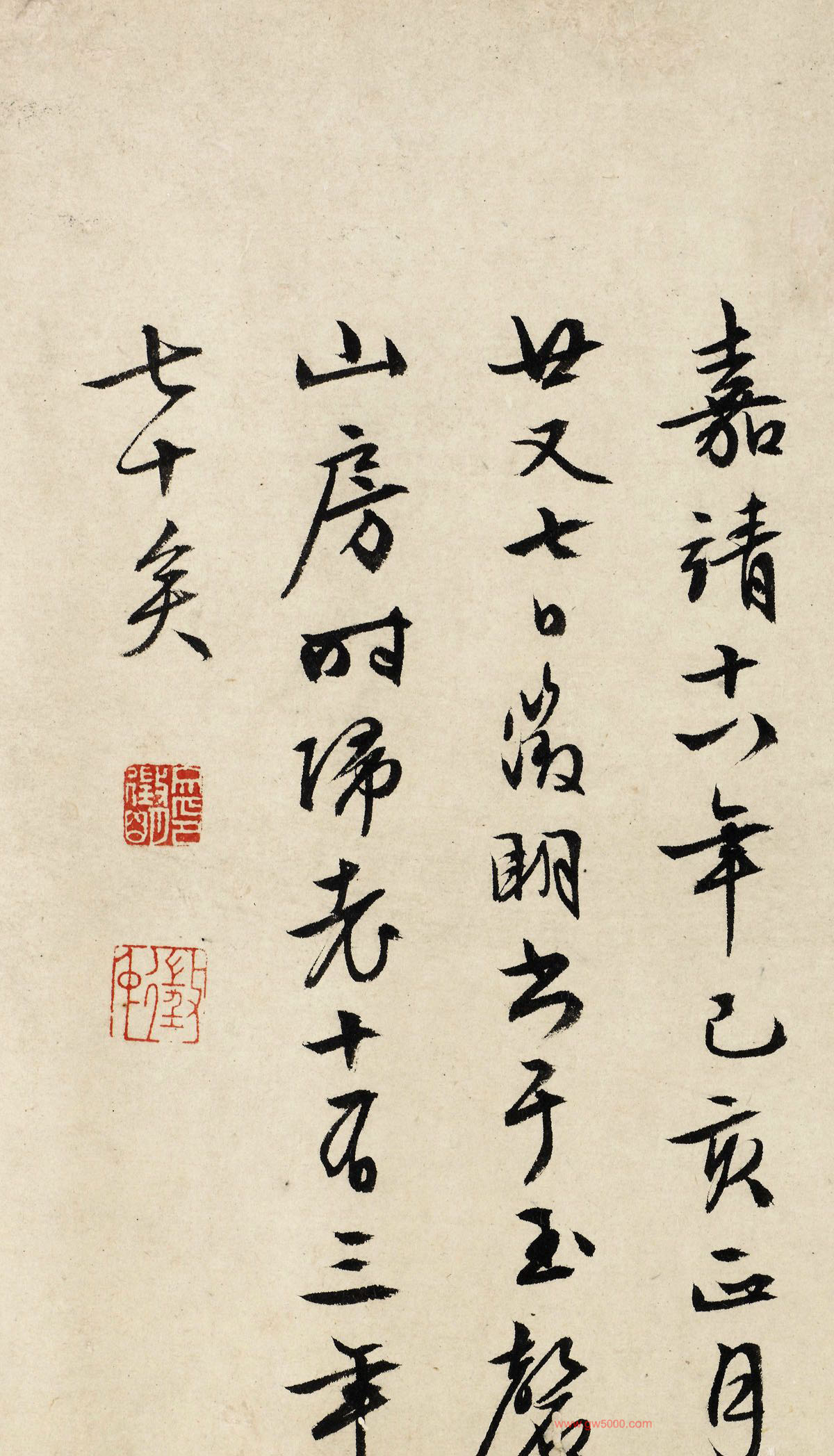 款署:嘉靖十八年己亥(1539)正月廿又七日,徵明书于玉磬山房,时归老十有三年,年七十矣。