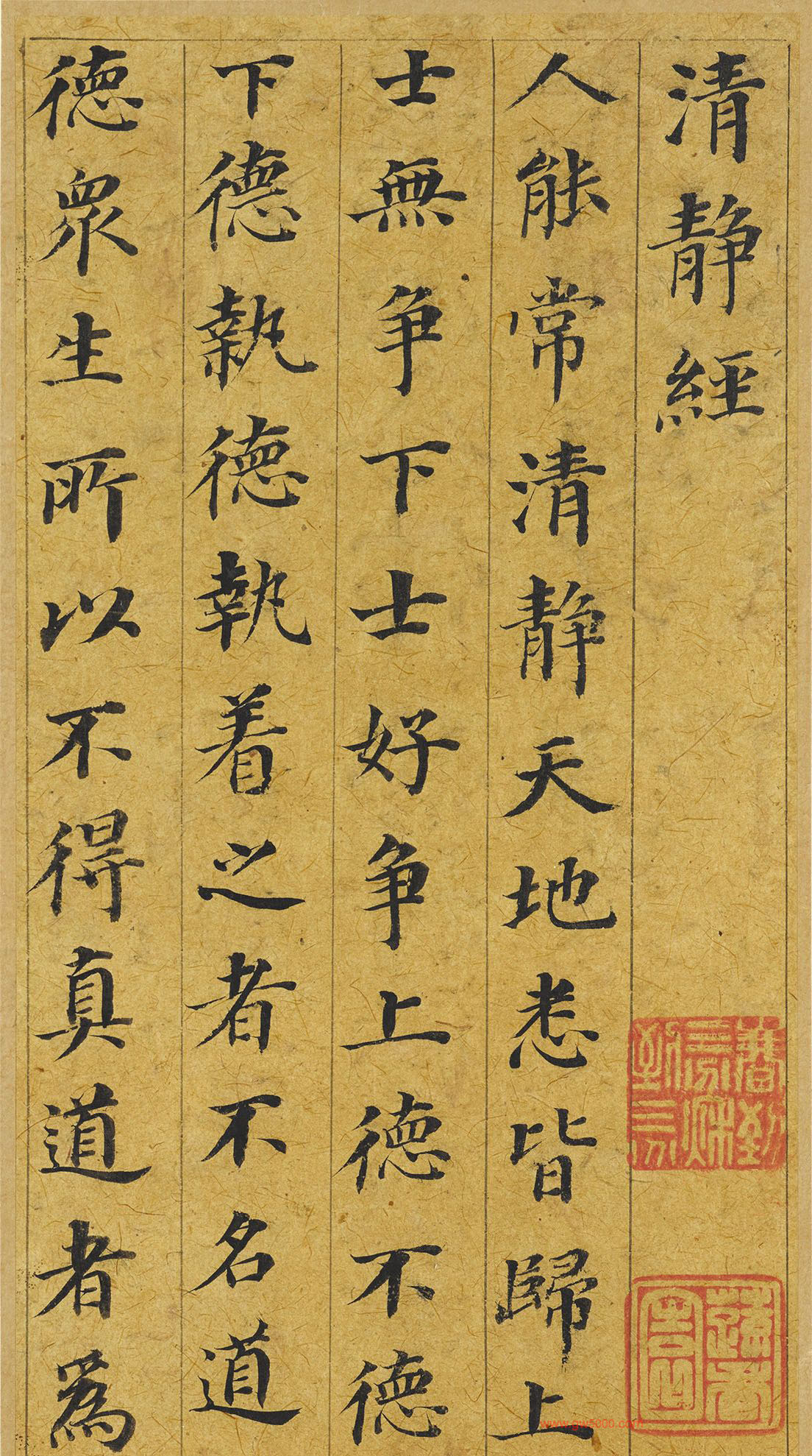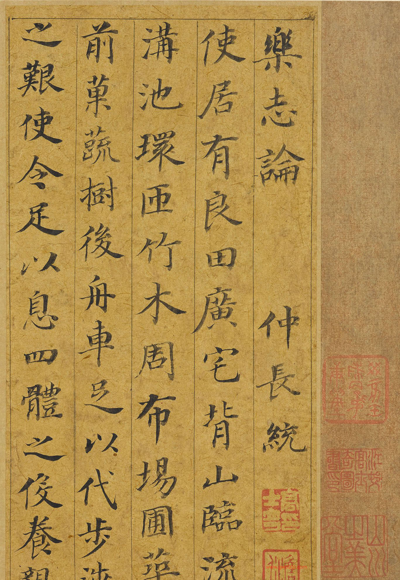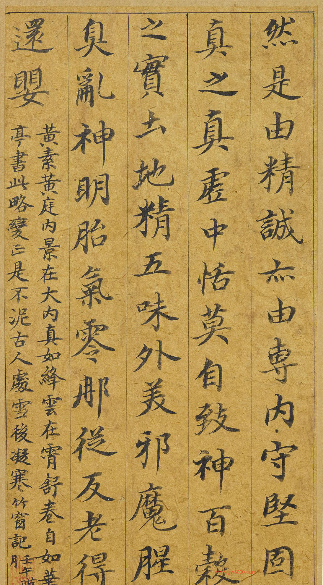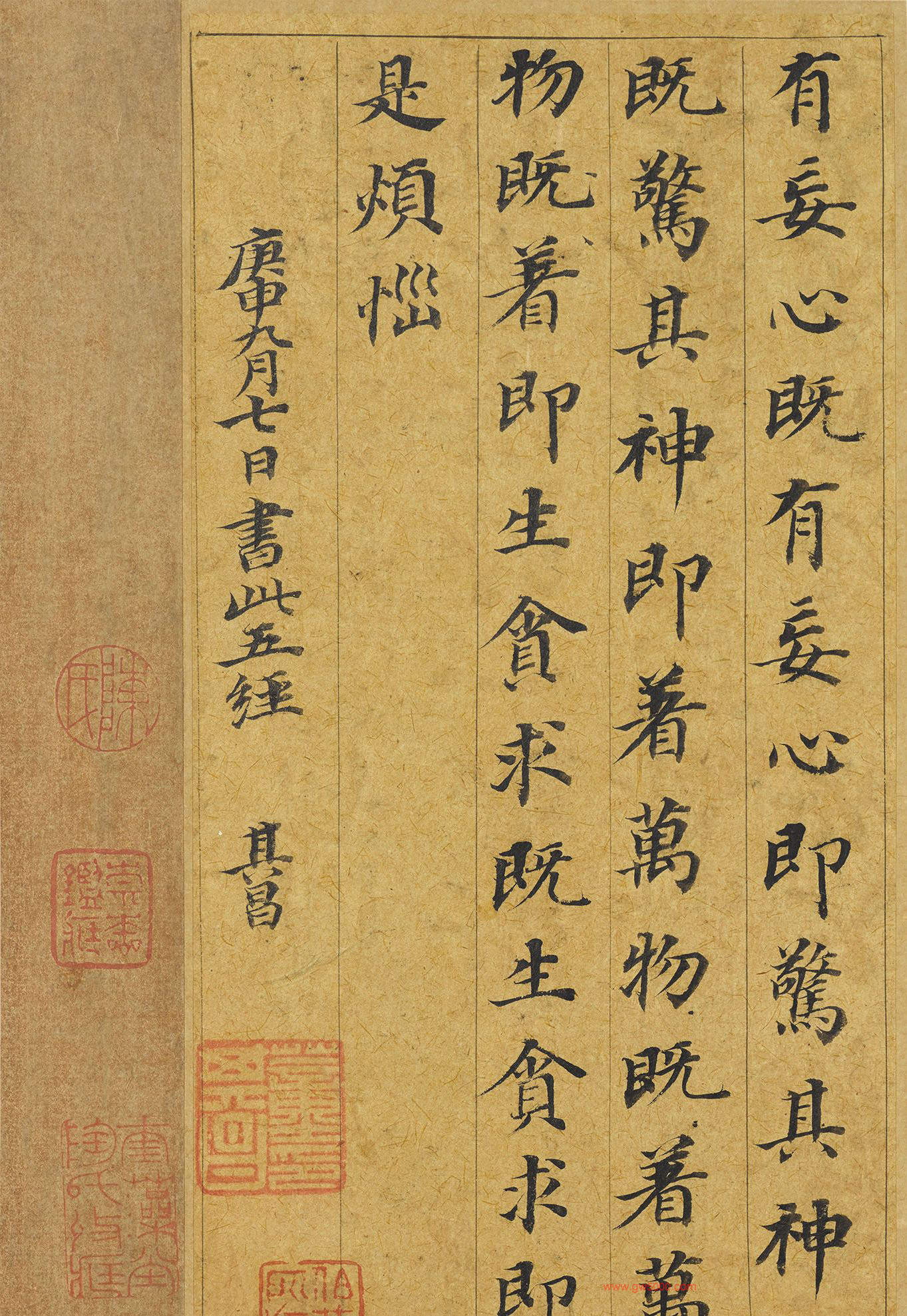 此册小楷书《乐志论》一篇,又《阴符》、《西升》、《度人》、《内景》、《清净》五经各一段。《乐志论》书于万历四十六年(1618),余各篇书于1620年,董氏时年分别为64、66岁。由于关系到科举和仕途,董其昌对小楷非常重视,从钟、王小楷,到唐代各大家,甚至宋元人小楷,无不加以关注。此册所写的五本经都有古代大家的传本得到董氏鉴藏,其中《内景经》还曾刻于《戏鸿堂帖》卷首。