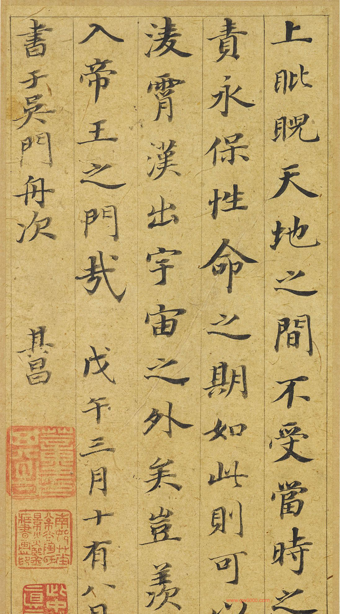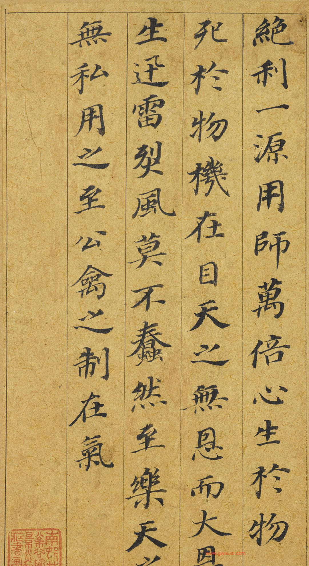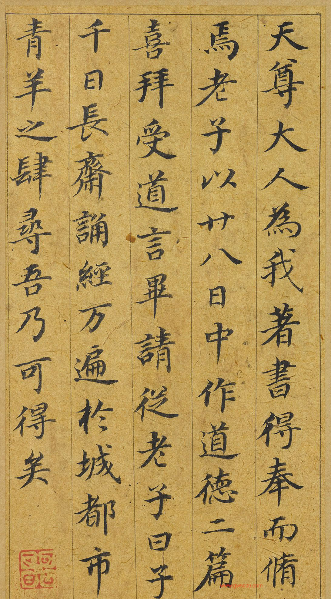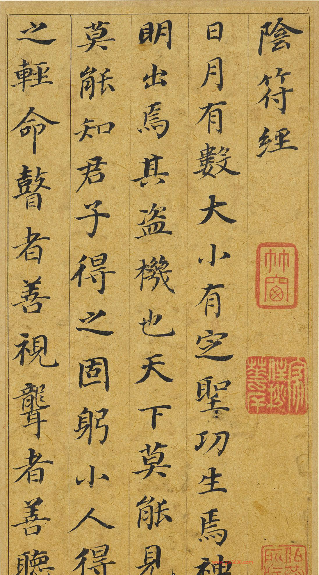 此册小楷书《乐志论》一篇,又《阴符》、《西升》、《度人》、《内景》、《清净》五经各一段。《乐志论》书于万历四十六年(1618),余各篇书于1620年,董氏时年分别为64、66岁。由于关系到科举和仕途,董其昌对小楷非常重视,从钟、王小楷,到唐代各大家,甚至宋元人小楷,无不加以关注。此册所写的五本经都有古代大家的传本得到董氏鉴藏,其中《内景经》还曾刻于《戏鸿堂帖》卷首。