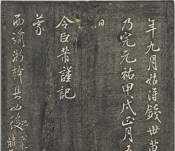 释文:大中祥符既降,(阙)天子本尊祖之义,范金为容,奉于玊清髹木之式,安于明道,背负乾冈,面奠大丘,坤震两山,左盘右纡。浊〈氵迅〉清演二流,前媚起坎朝巽。美哉吉土。后八十三年,观宇隳,徒弗虔,吏弗视,壬申八月,伻图以请,明年九月,始得钱三十万。乃完。元祐甲戌正月五日令臣芾谨记