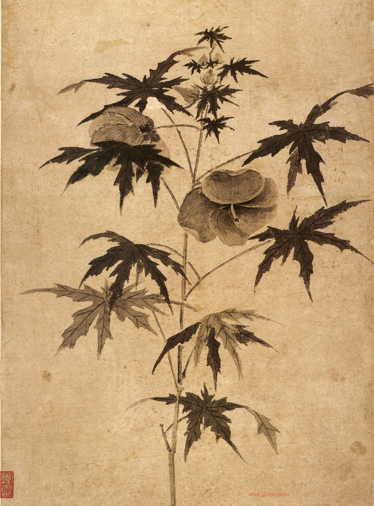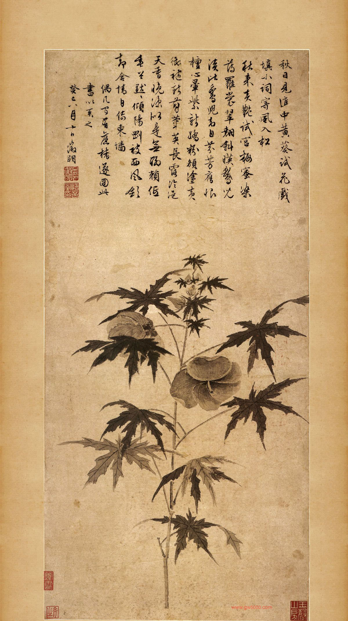 文徵明在花鸟画上自成一派。他的设色花卉师从沈周,但工写结合,设色雅丽,有自己的特色。《秋葵图》是其墨笔画佳作。此画写秋葵一枝,取其正面之势,与一般斜欹折枝不同。花开粲然,叶呈多貌,浓墨淡墨穿插其间,神韵清俊舒朗。