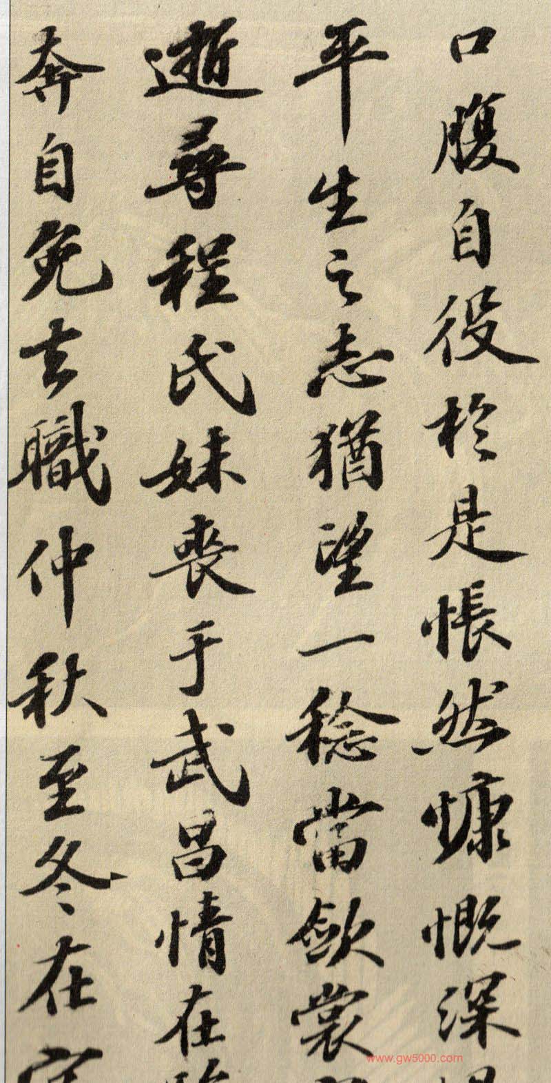 苏轼早年学“二王”,中年以后学颜真卿、杨凝式,晚年又学李北海,又广泛涉猎晋唐其他书家,形成深厚朴茂的风格。他的书法,用笔多取侧势,结体扁平稍肥。这与他握笔的姿势也很有关系,苏轼执笔为“侧卧笔”,即毛笔侧卧于虎口之间,类似于现在握钢笔的姿势,故其字右斜,扁肥。