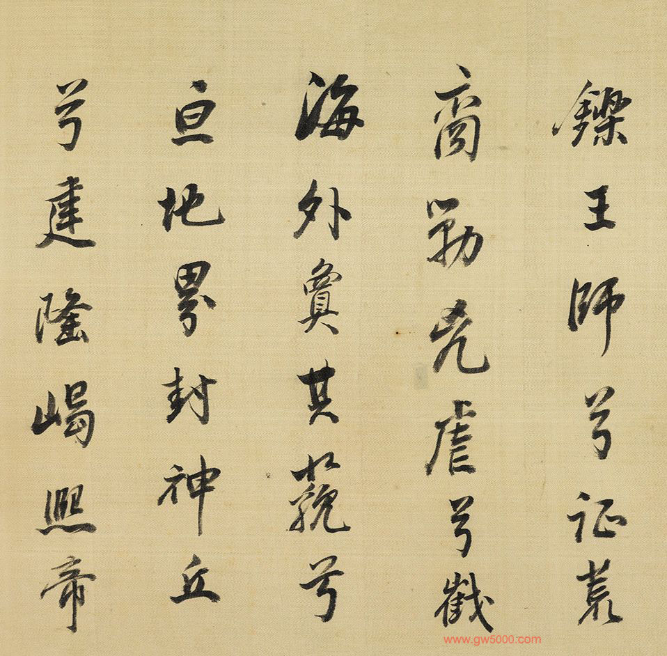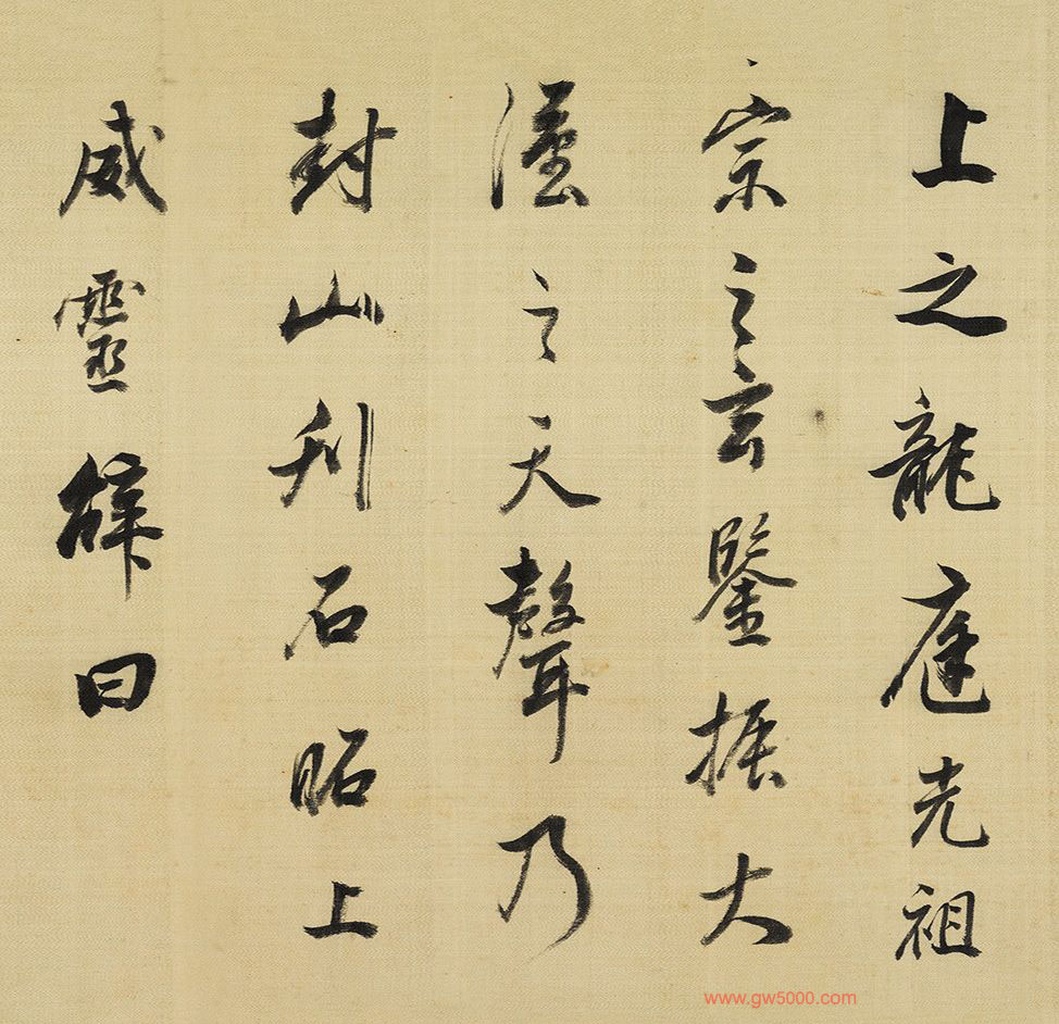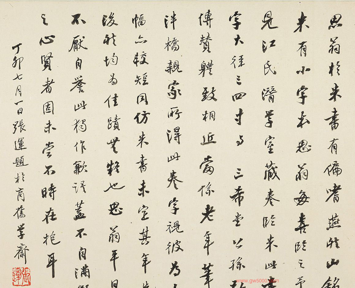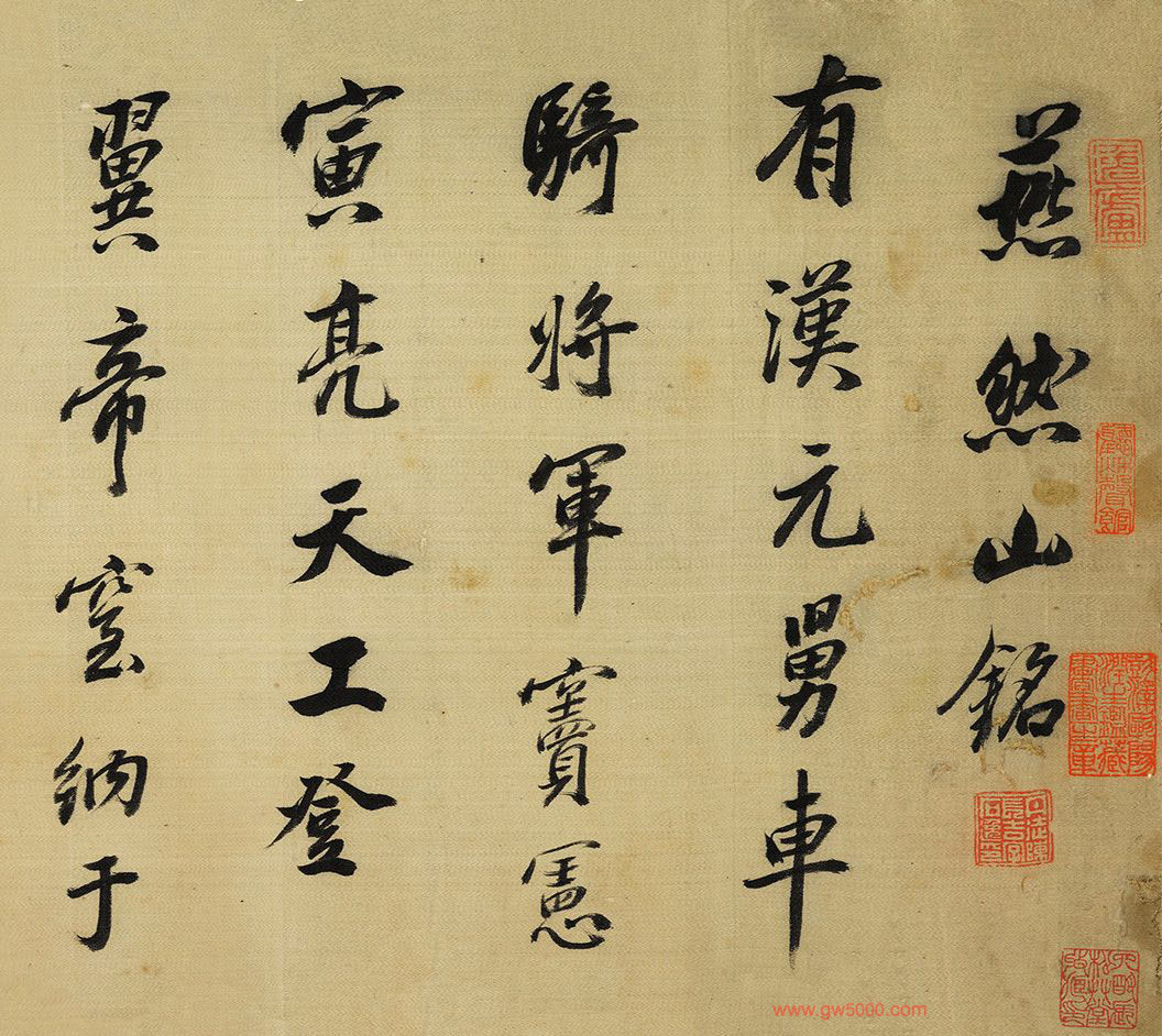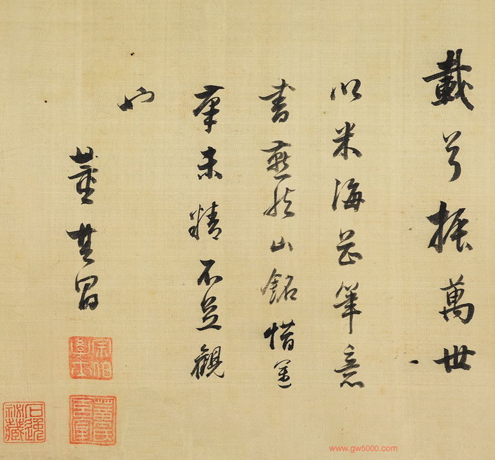 此卷为董氏晚年以米芾笔意所书《燕然山铭》,钤“宗伯学士”印,故至少是1623年董氏70岁后作品。此卷绫本,较一般的学米之作更加沉厚,墨色清润,肌理亦显生涩稳重。与原文相比,董书有多处改写词句,并有错别字,这在董书中较为常见。董氏偏爱米书,于仿米最为得意。米芾写过几本《燕然山铭》,董亦多次临写。至于此卷系临摹哪本米芾书《燕然山铭》,卷后有张运题跋考释。