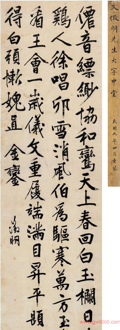 签条:文徵明先生大字中堂,民国九年四月重装。