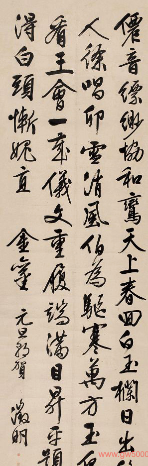 文徵明行书七言律诗《元旦朝贺》,尺寸:348×104cm,2009年北京匡时拍品。