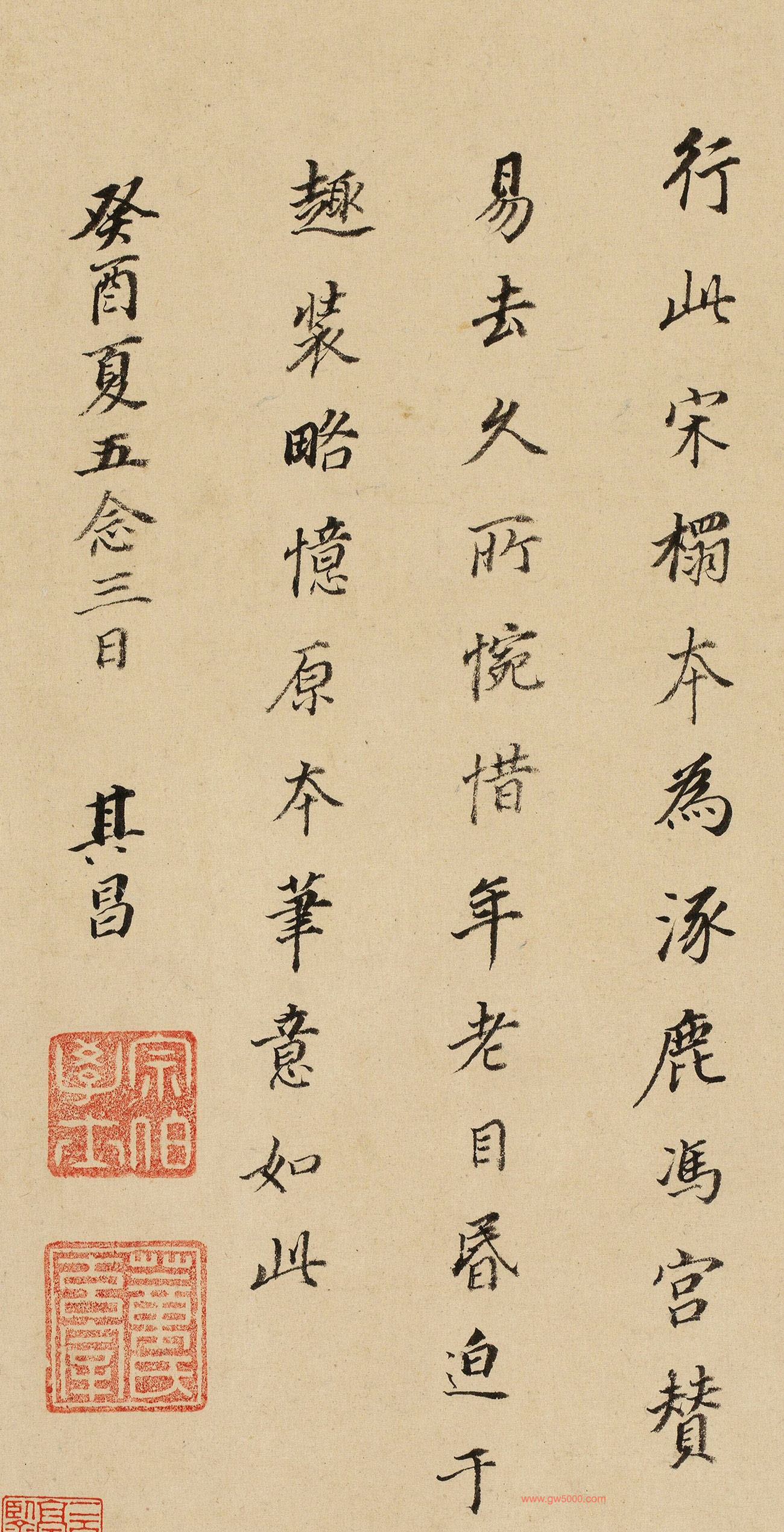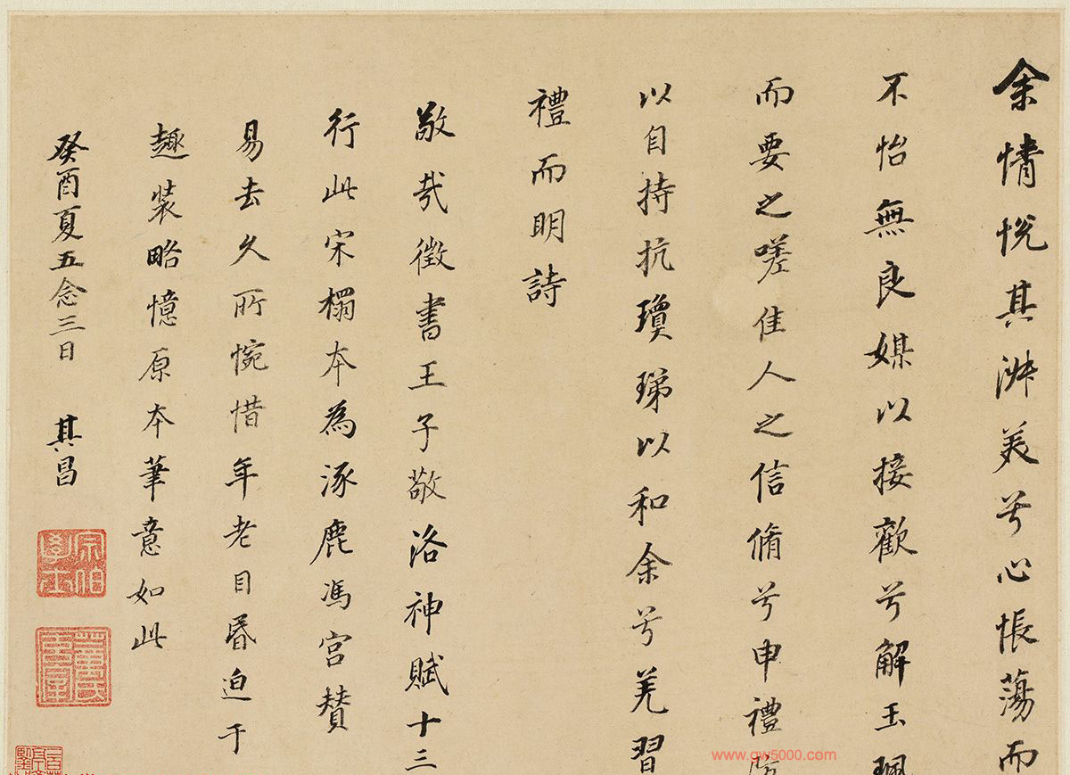 敬哉征书王子敬洛神赋十三行。此宋榻本为涿鹿冯宫赞易去,久所惋惜,年老目昏,迫于趣装略,忆原本笔意如此。癸酉夏五念三日,其昌。