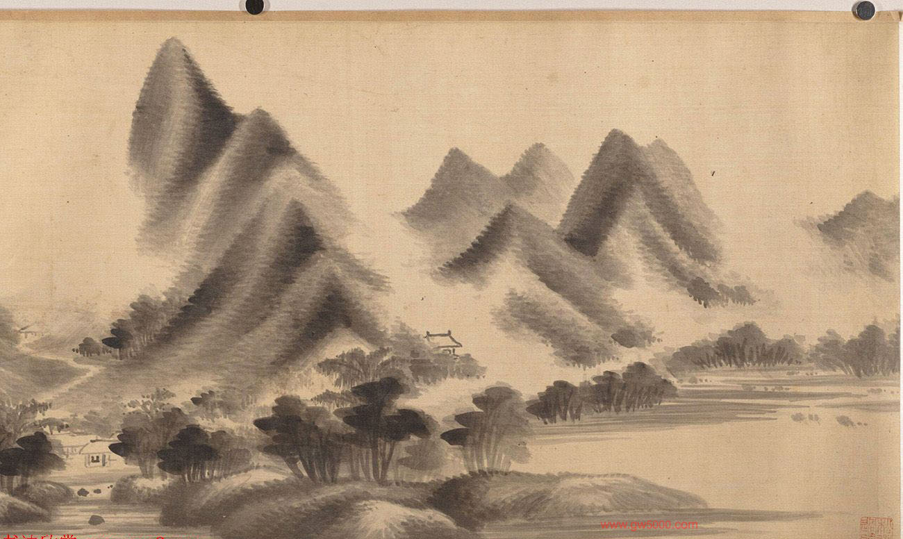 米氏父子是以点和块绘画,形成了独特的“米家山水”,又称为“无骨山水”。绘山峰高耸,起伏连绵,两山间云雾缭绕,似入仙境,山脚下溪水成河,岸边树木苍翠。