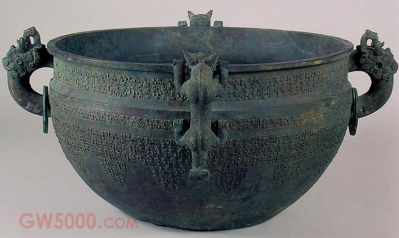 《攻吴王夫差鉴》为夫差所铸器。《说文》金部说:“鉴,大盆也”。《周礼》凌人注说:“鉴如*,大口,以盛冰,置食物以御温气。”此兽耳衔环。腹饰蟠虺纹及叶形纹。腹内铭文三行十三字。於同治年间(公元1862--1874年)在山西州蒙王村出土。春秋时期的书法出现了因地域而风格各异的现象,东南方各国的铜器铭文都有美化的趋向,或作鸟虫书,或作蝌蚪书等。而《攻吴王夫差铿》谷作瘦长体。字形、笔划不加修饰。文字显得质朴规整,线条均匀,起止尖锋。字距、行距较大,布局疏朗。已具后来小篆的雏形。