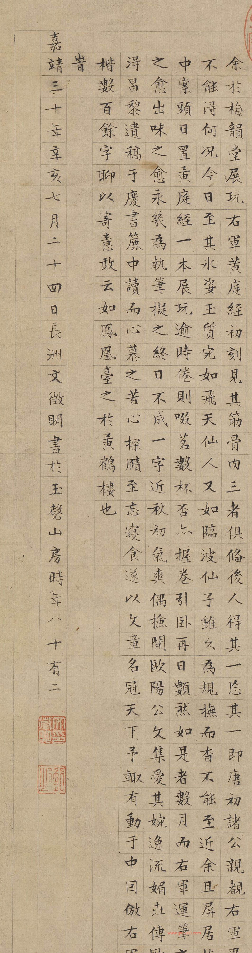 款识:嘉靖三十年辛亥七月二十四日长洲文徵明书于玉磬山房,时年八十有二。