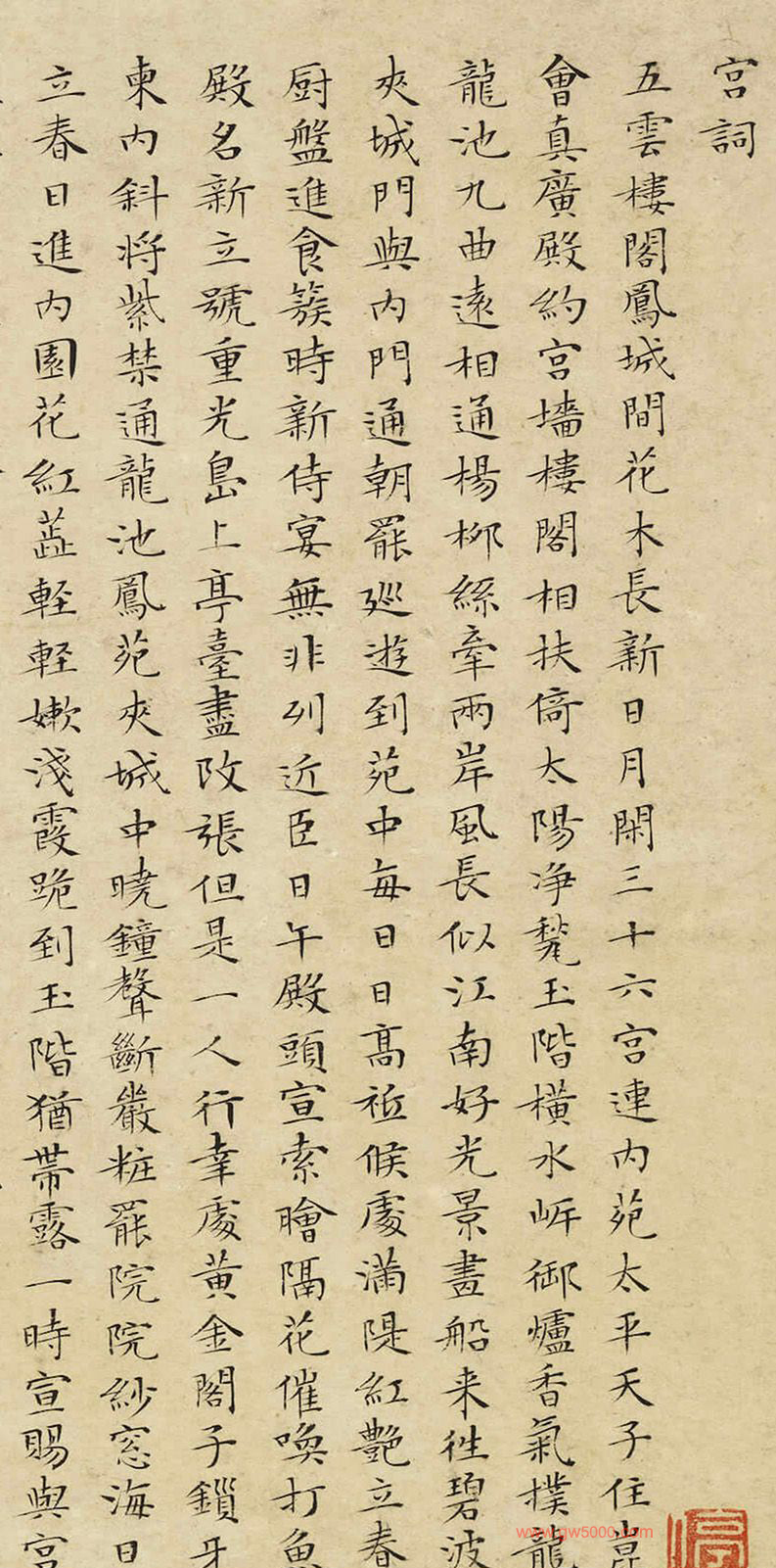偶閱仇生所繪金碧四幀,精工綺麗,不減唐之小李、宋之伯駒矣。漫書宮詞百首,以附不朽。長洲文徵明識。