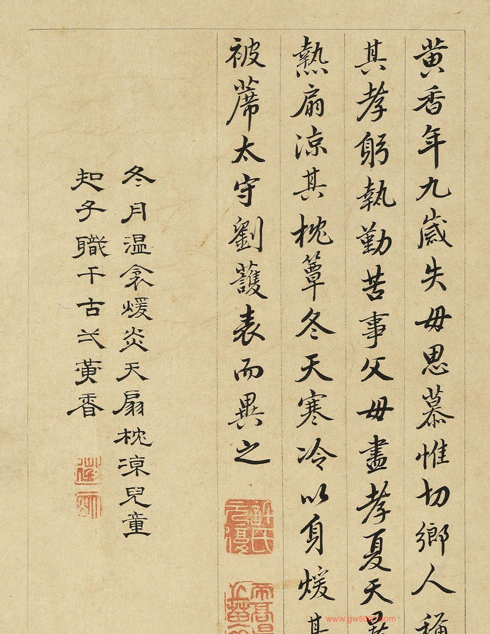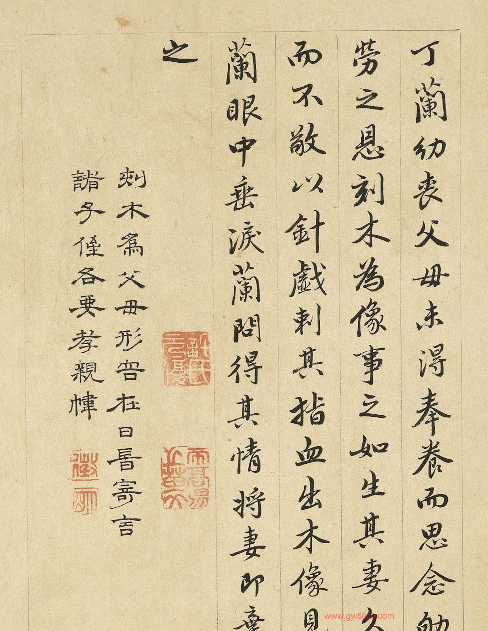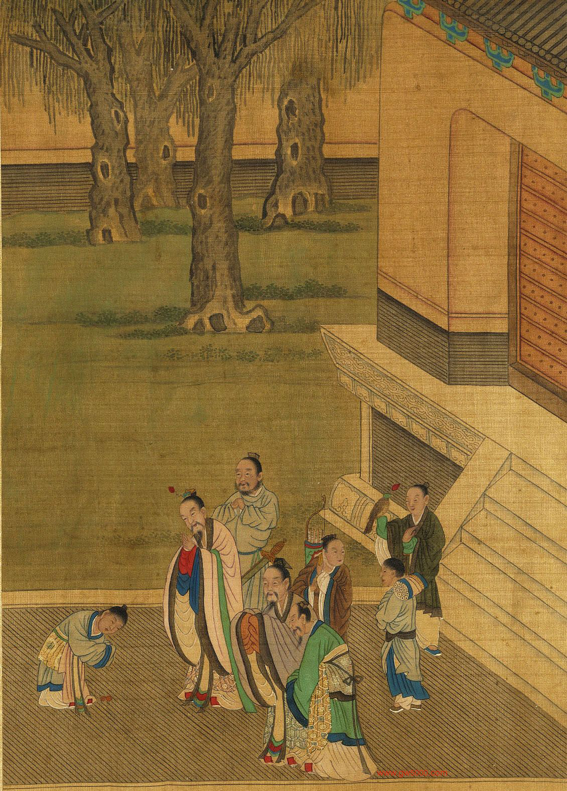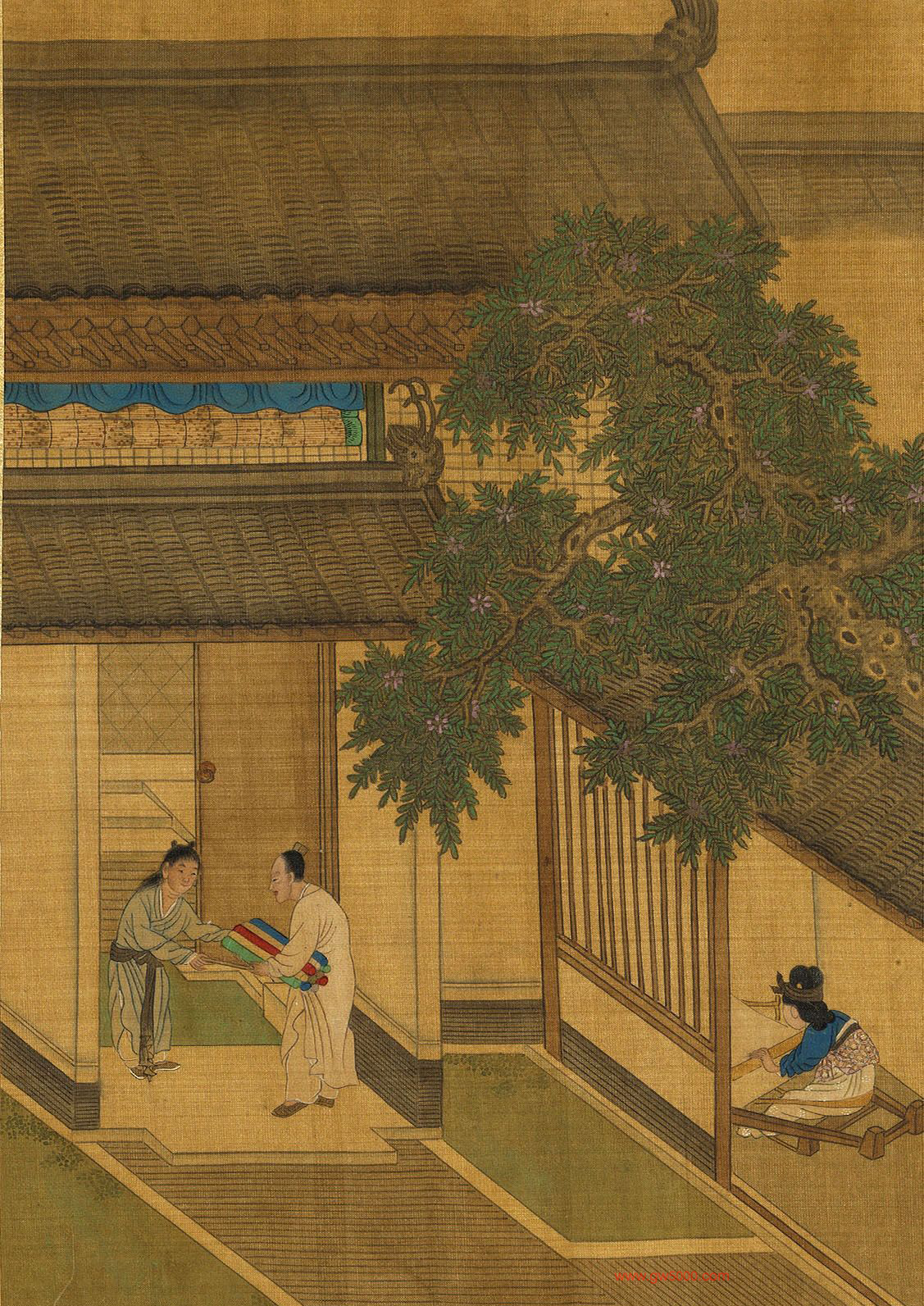 《純孝圖》右圖左文,托名仇英,然而設色與人物造型均非仇英風格。人物造型已略帶扭曲,人物開臉高光對比明顯,呈現更多清代的風格。