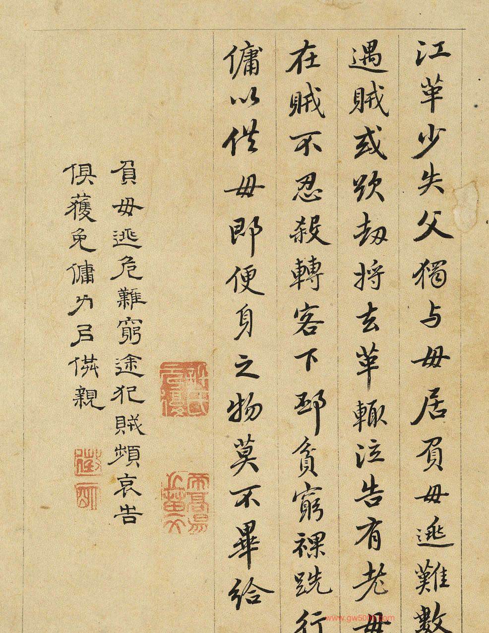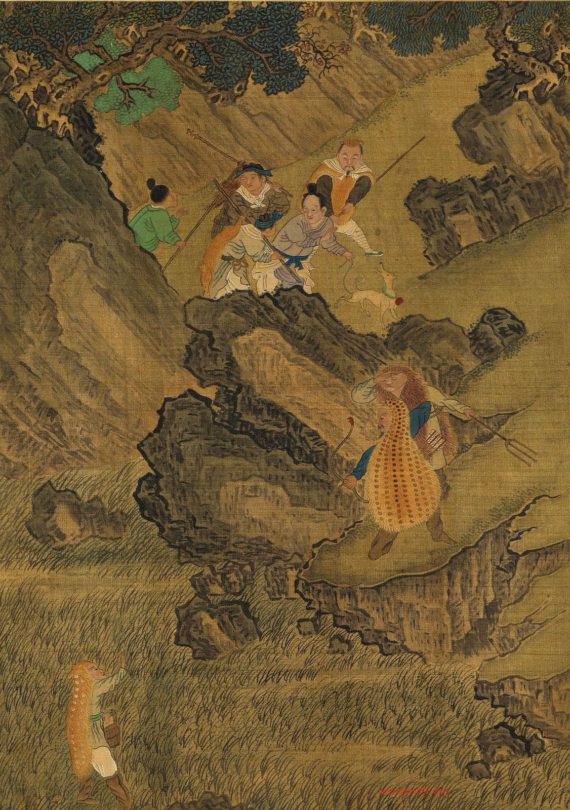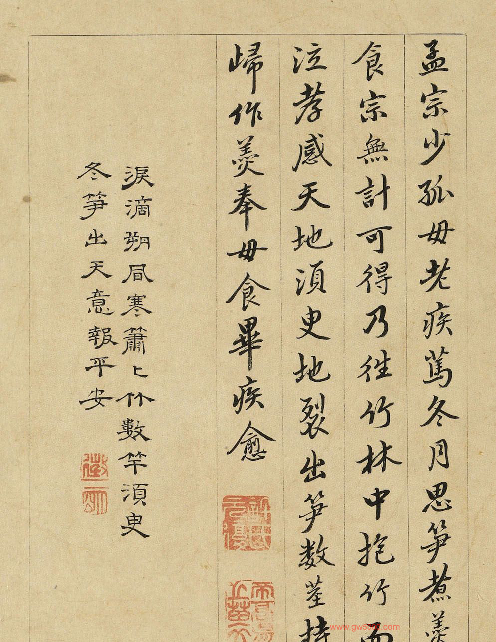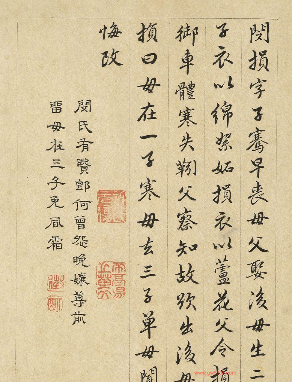 《純孝圖》右圖左文,托名仇英,然而設色與人物造型均非仇英風格。人物造型已略帶扭曲,人物開臉高光對比明顯,呈現更多清代的風格。