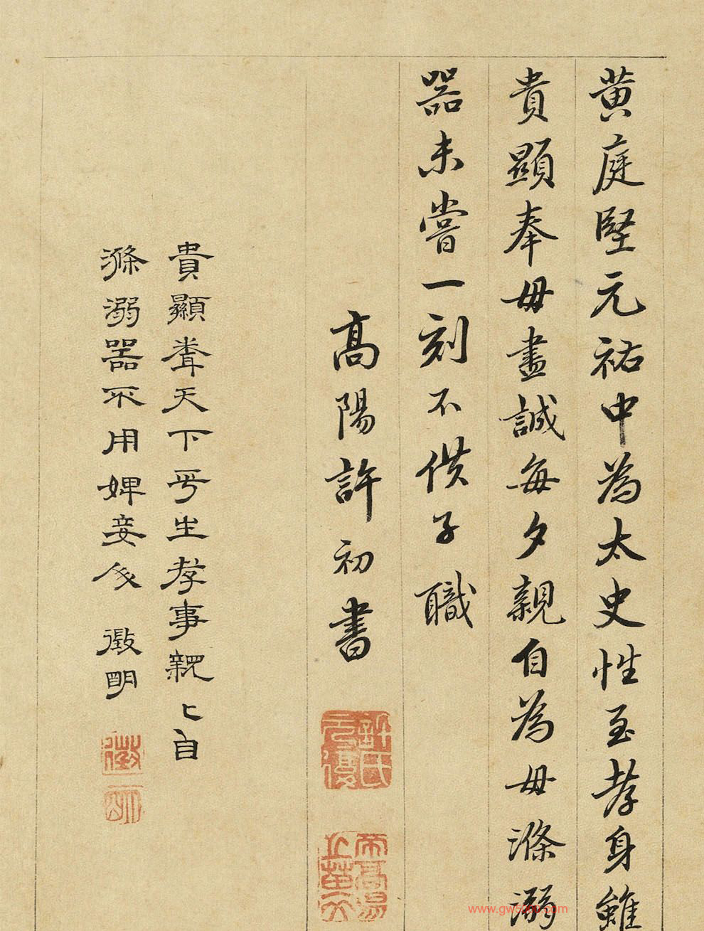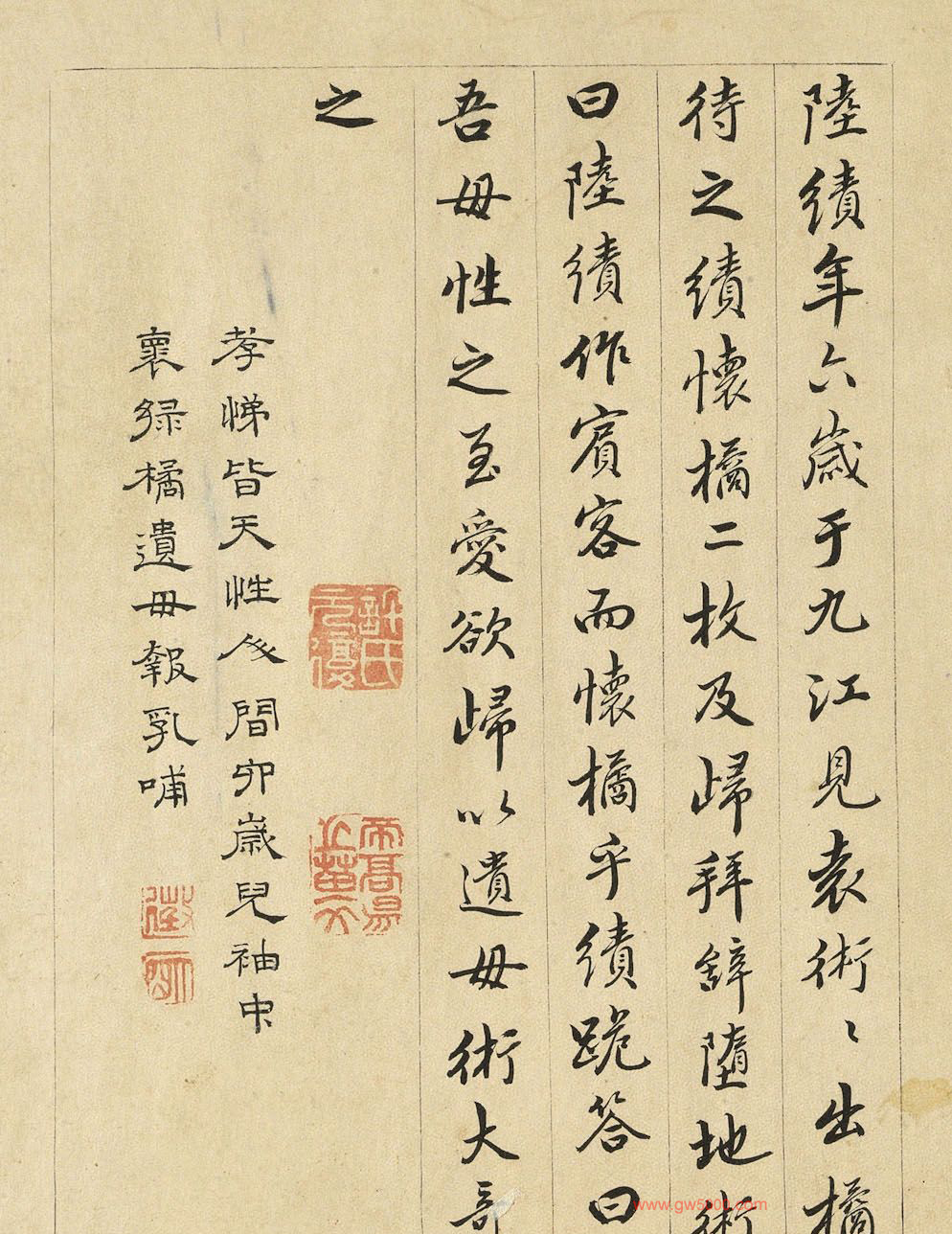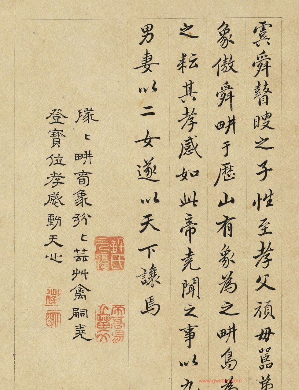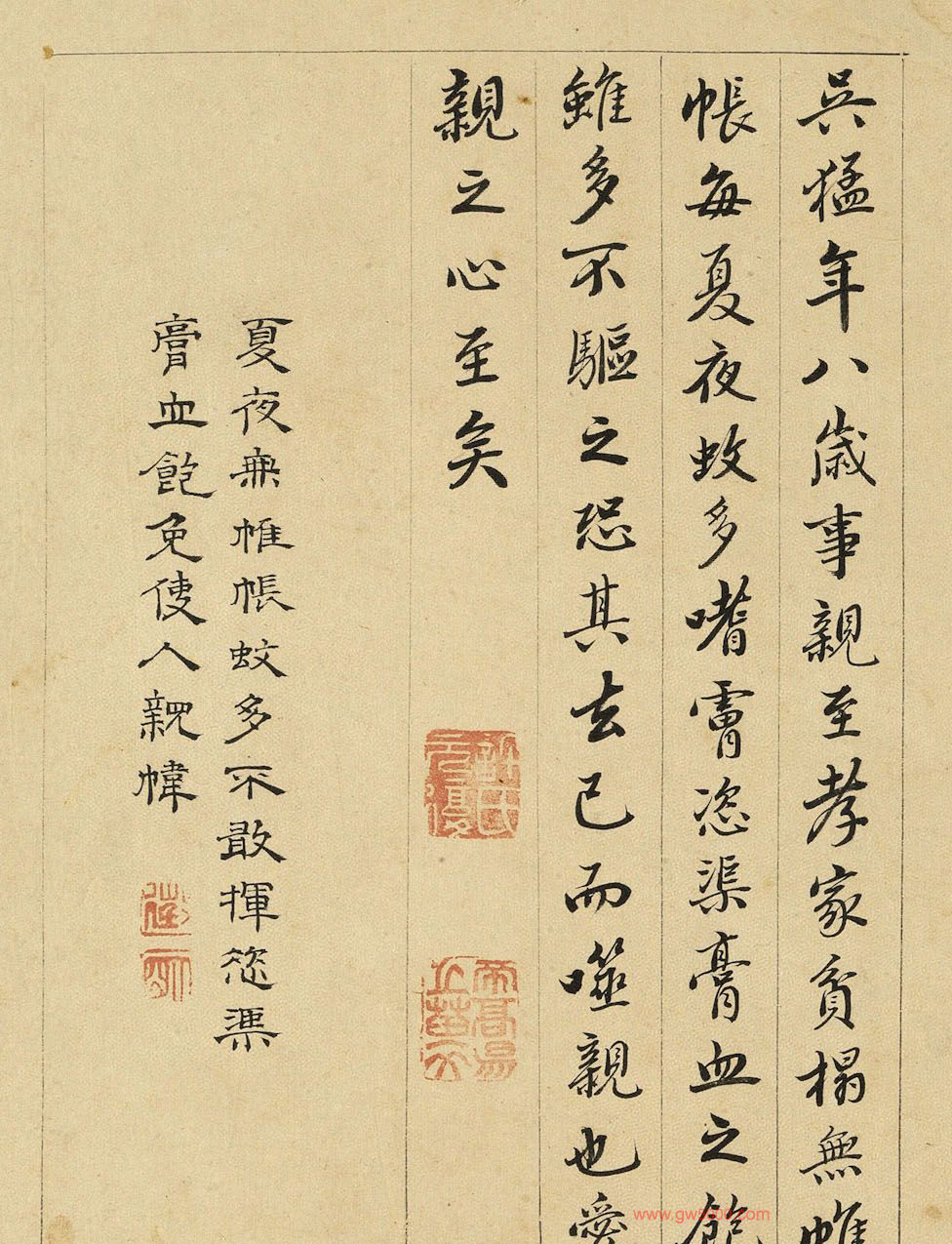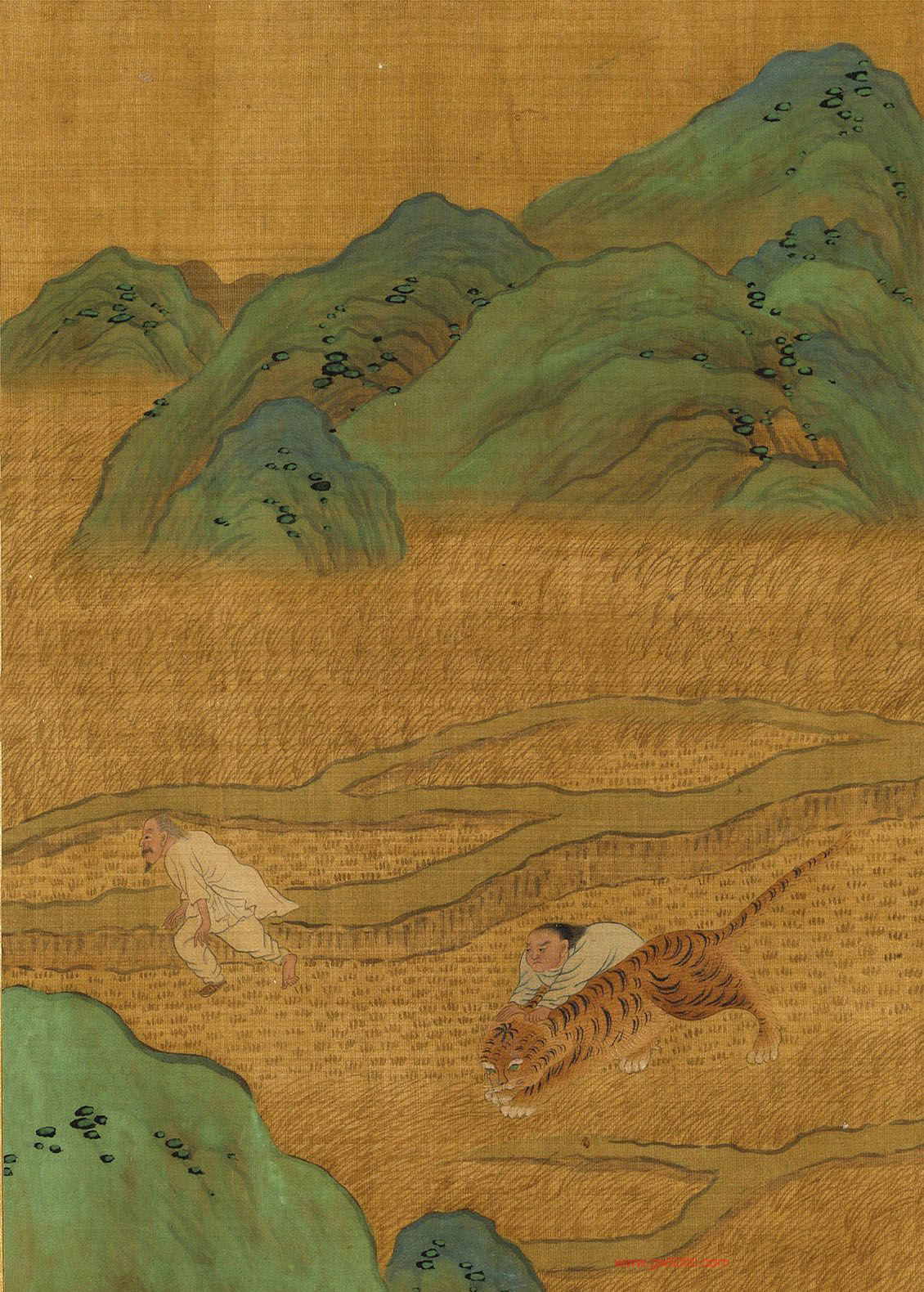 《純孝圖》右圖左文,托名仇英,然而設色與人物造型均非仇英風格。人物造型已略帶扭曲,人物開臉高光對比明顯,呈現更多清代的風格。