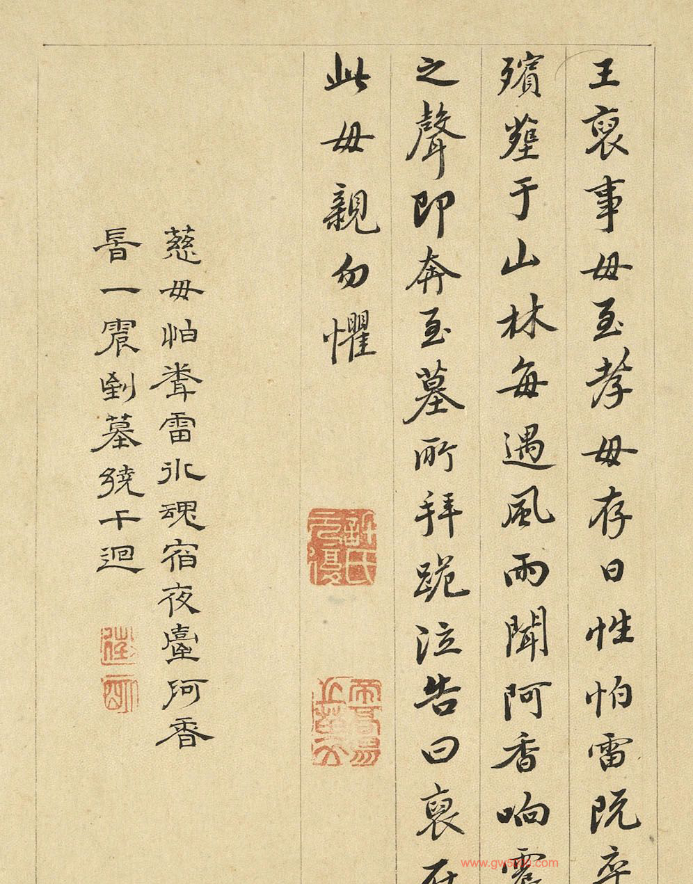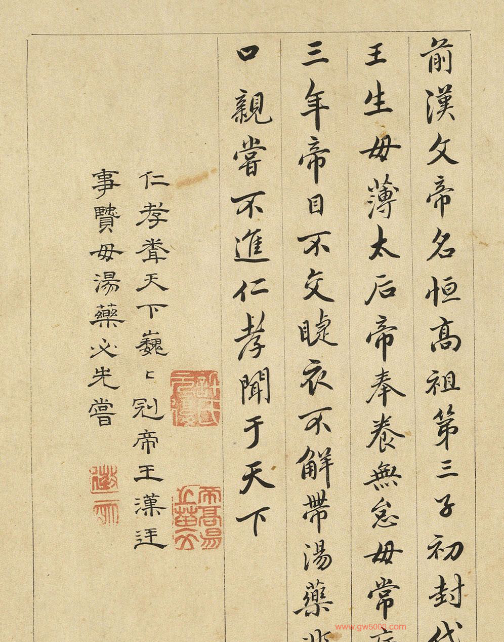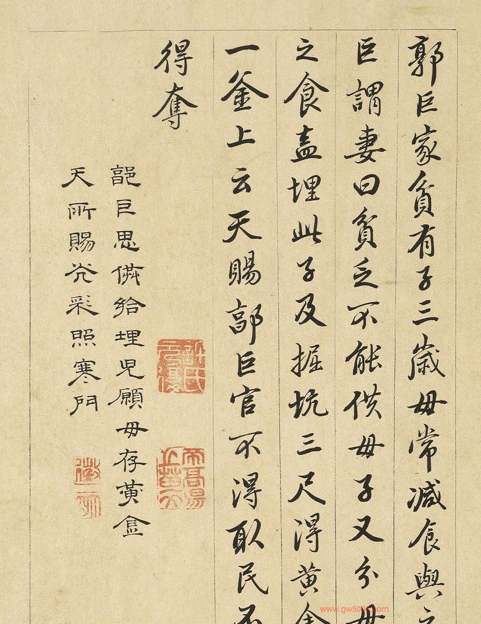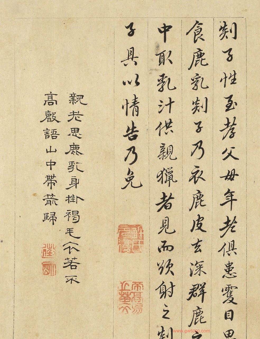 《純孝圖》右圖左文,托名仇英,然而設色與人物造型均非仇英風格。人物造型已略帶扭曲,人物開臉高光對比明顯,呈現更多清代的風格。