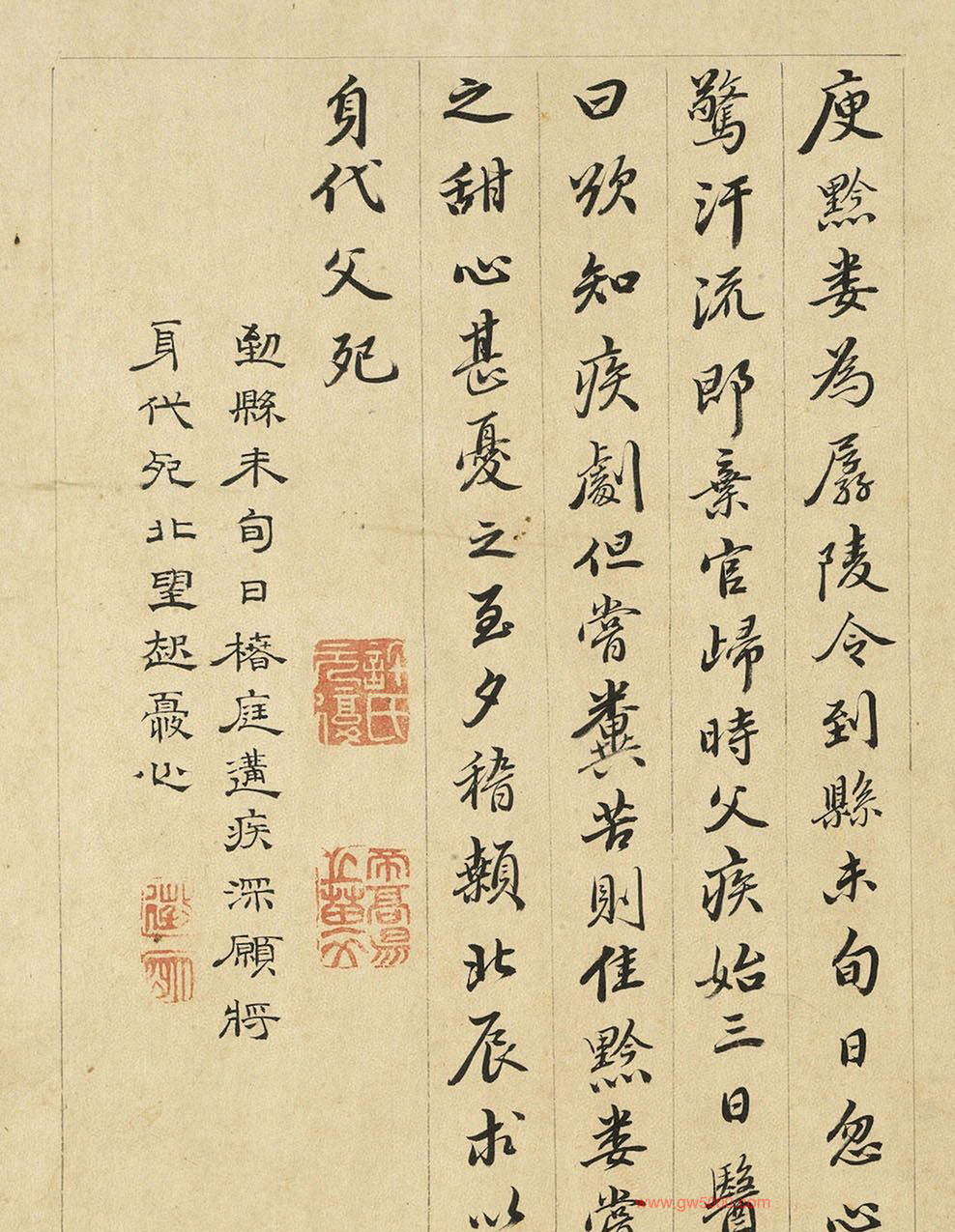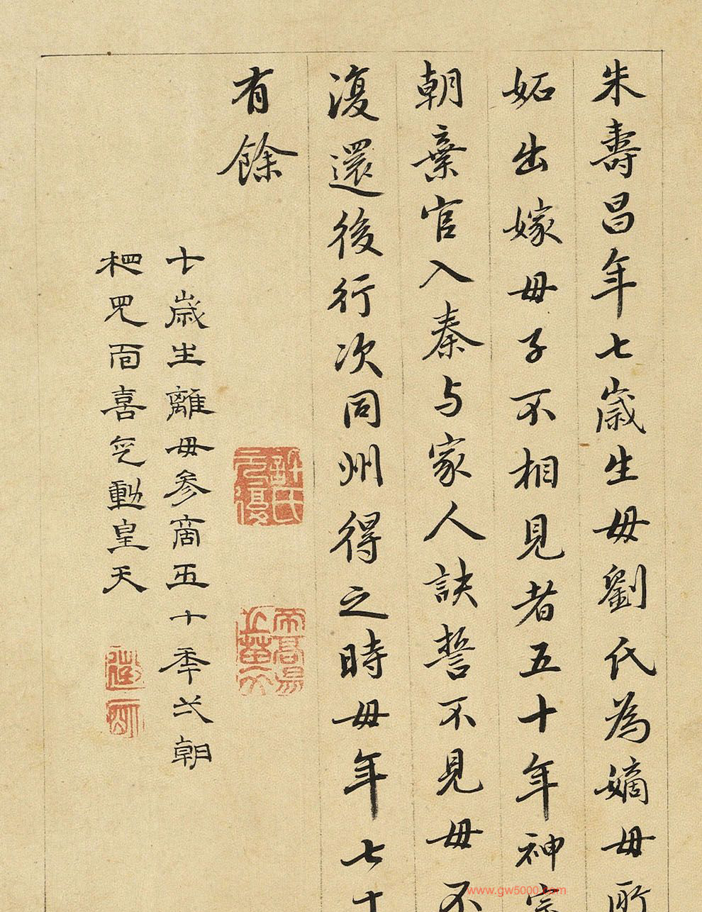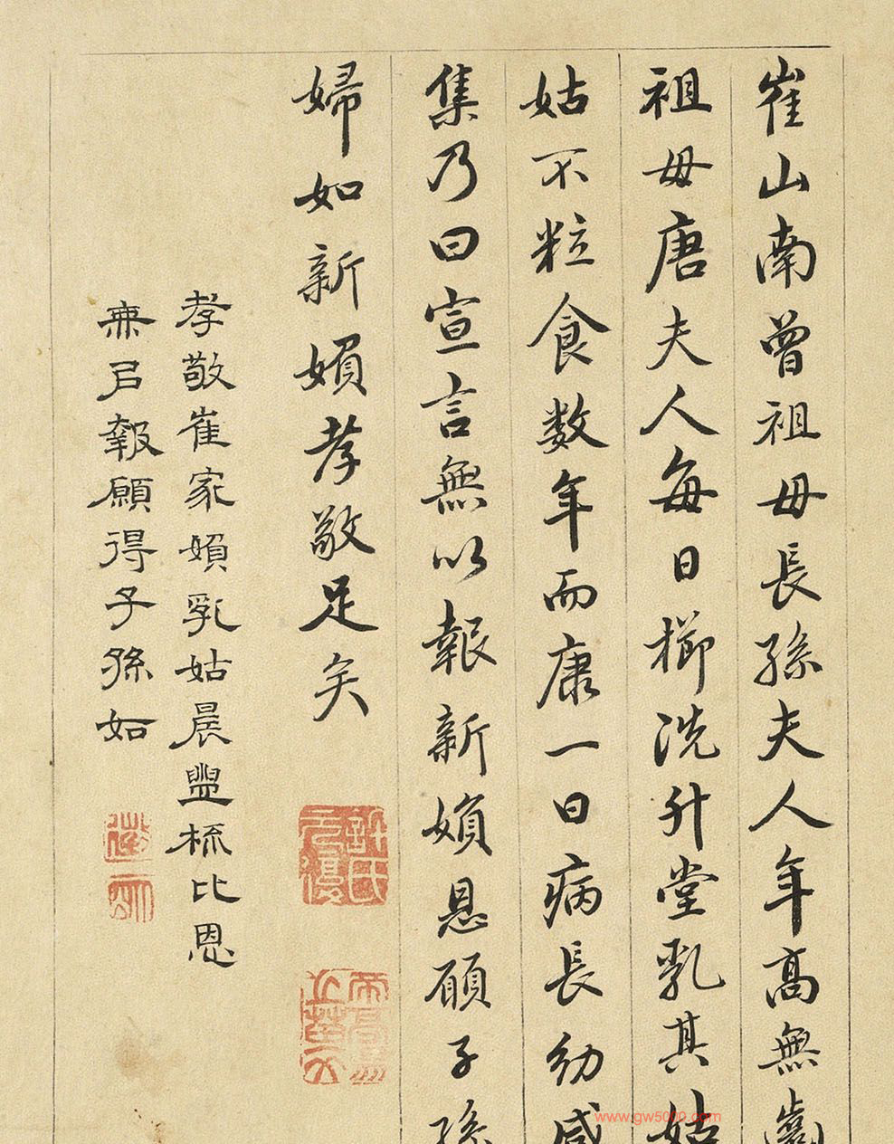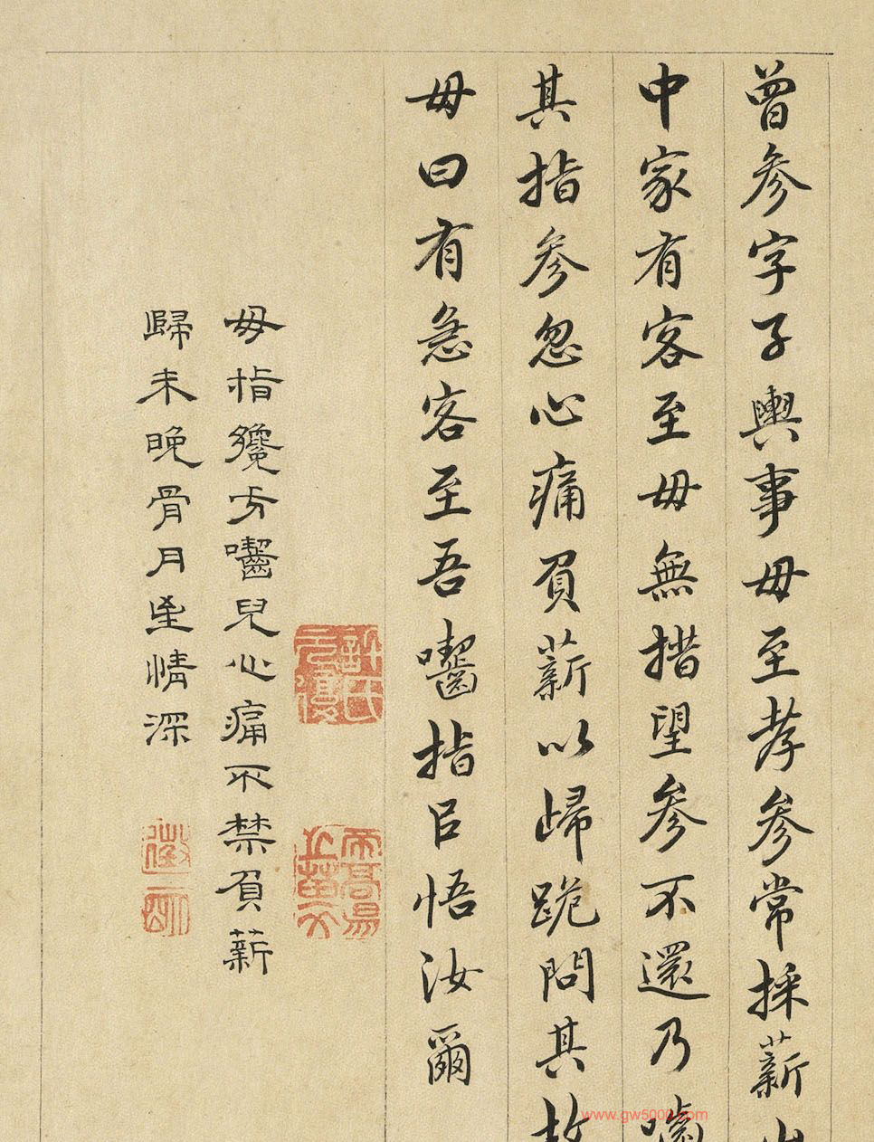 《純孝圖》右圖左文,托名仇英,然而設色與人物造型均非仇英風格。人物造型已略帶扭曲,人物開臉高光對比明顯,呈現更多清代的風格。