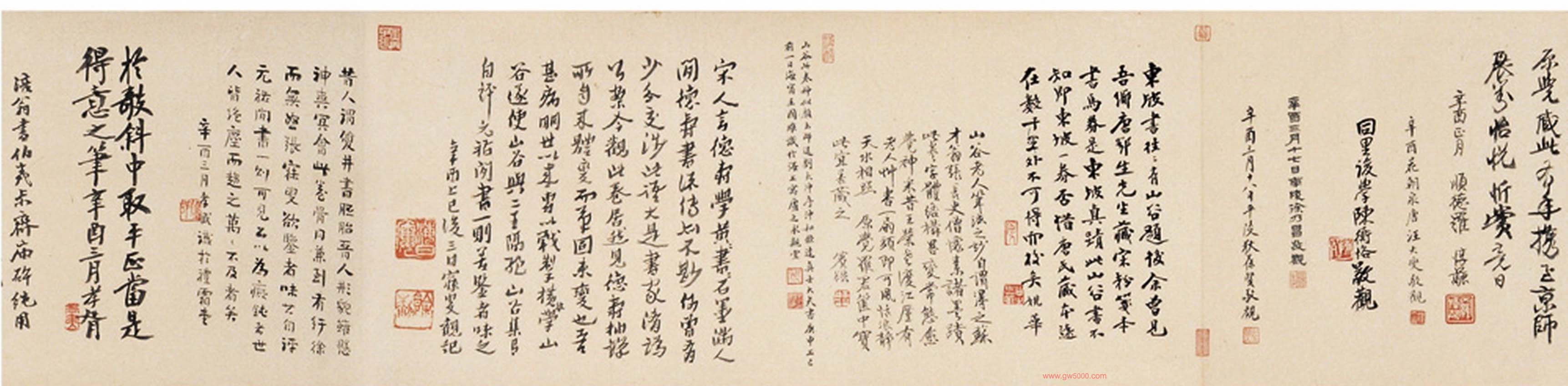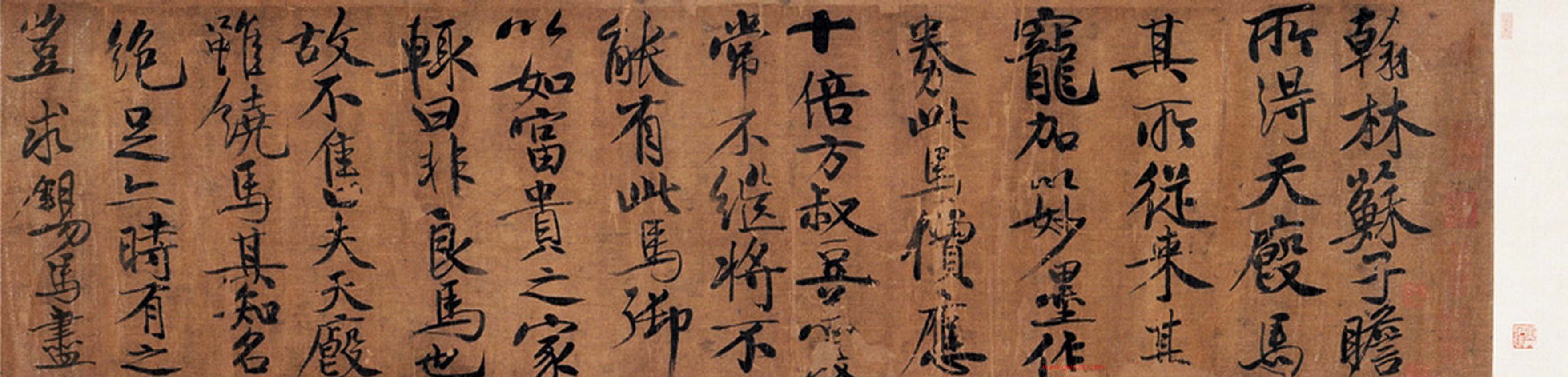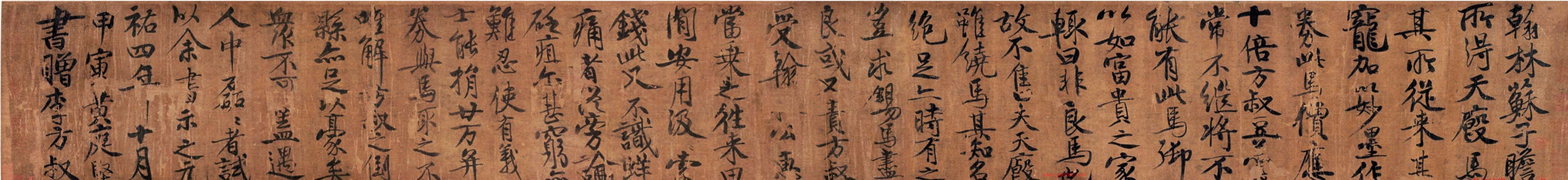 翰黄庭坚书苏东坡马劵后赠李方叔真迹卷林苏子瞻所得天马,其所从来甚宠,加以妙墨作劵,此马价应十倍,方叔豆羹常不继,将不能有此马,御以富贵之家,辄曰非良马也,固不售,失天虽饶马,其知名绝足亦持有之,岂求锡马尽良?或又责方叔受翰林公惠,当乘之往来田间,安用汲索钱?此又不识蛴痛者从旁论砭疽。尔甚穷亦难忍,使有义士能捐二十万并劵与马取之,不唯解方叔之倒县,亦足以豪矣。众不可,盖遇人中磊磊者试以余书示之?元祐四年十月甲寅黄庭坚书赠李方叔。