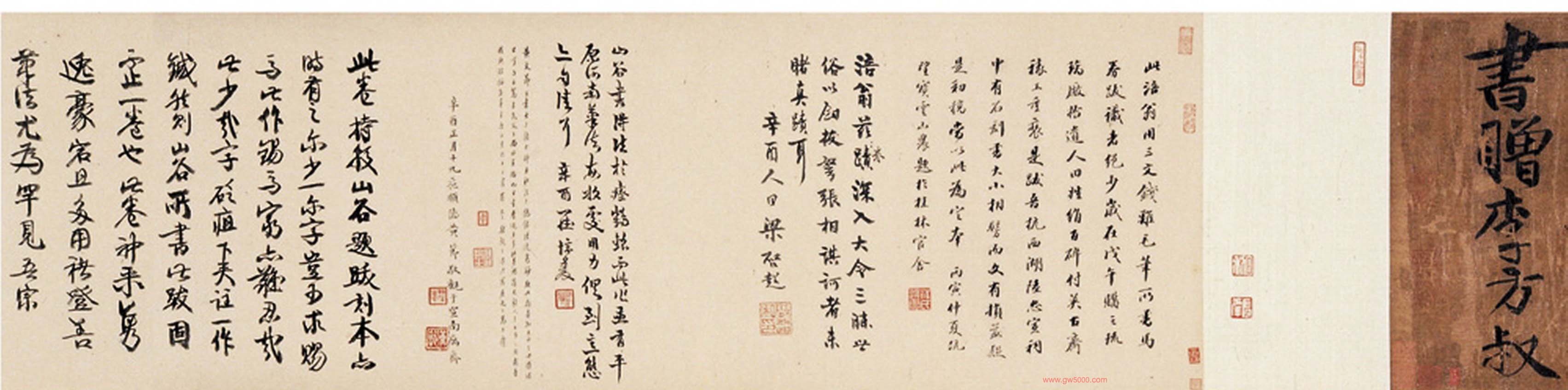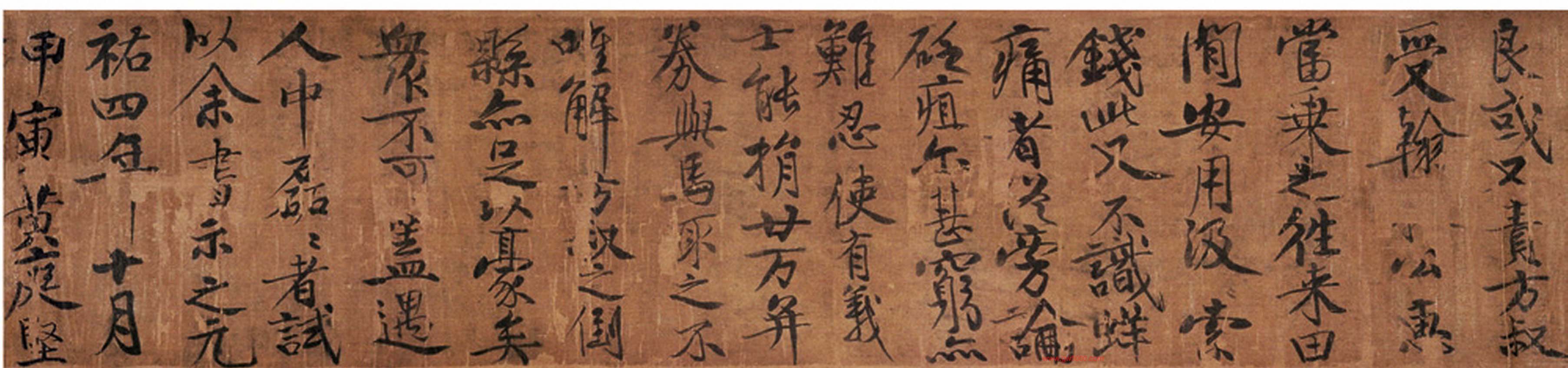 黄庭坚行楷书赏析《书赠李方叔真迹卷》(疑),全称《黄庭坚书苏东坡马劵后赠李方叔真迹卷》,是黄庭坚早期书法的典型巨作,全卷为手卷水墨绢本。通篇手卷为行楷书体,笔法苍劲老健,体势挺拔,纵横奇倔,奥拗清逸,凸现出其用笔以侧险取势的特点,由此卷可窥出黄庭坚书法变化的轨迹。