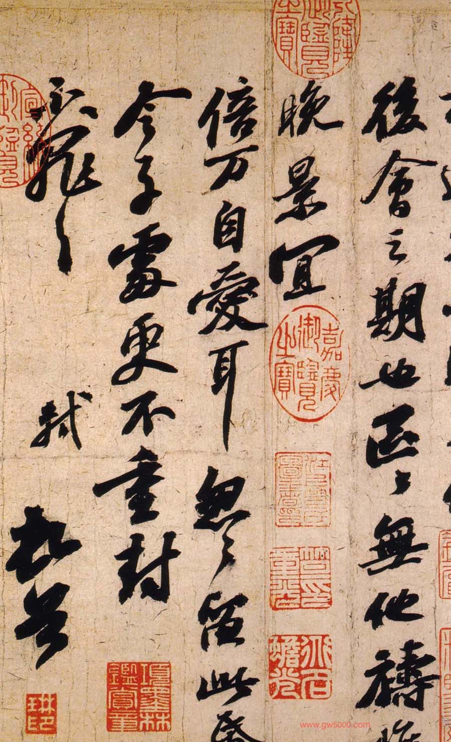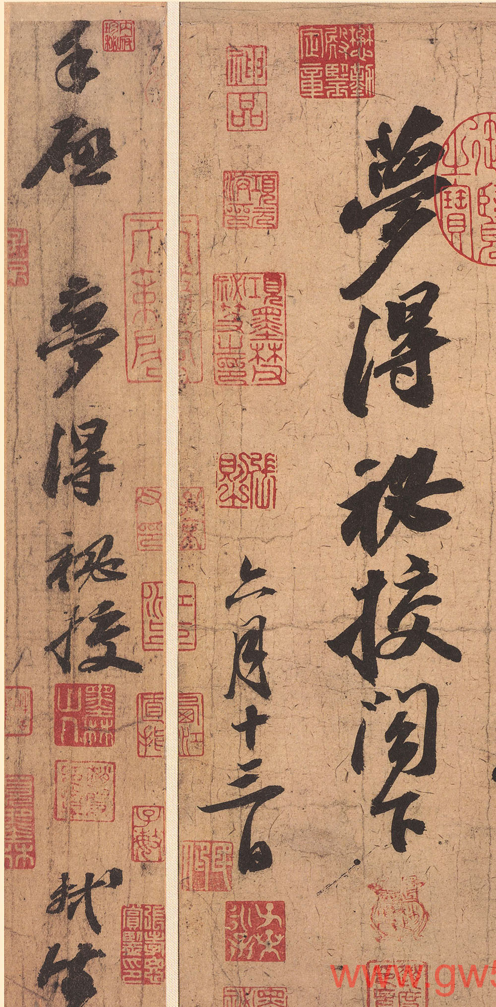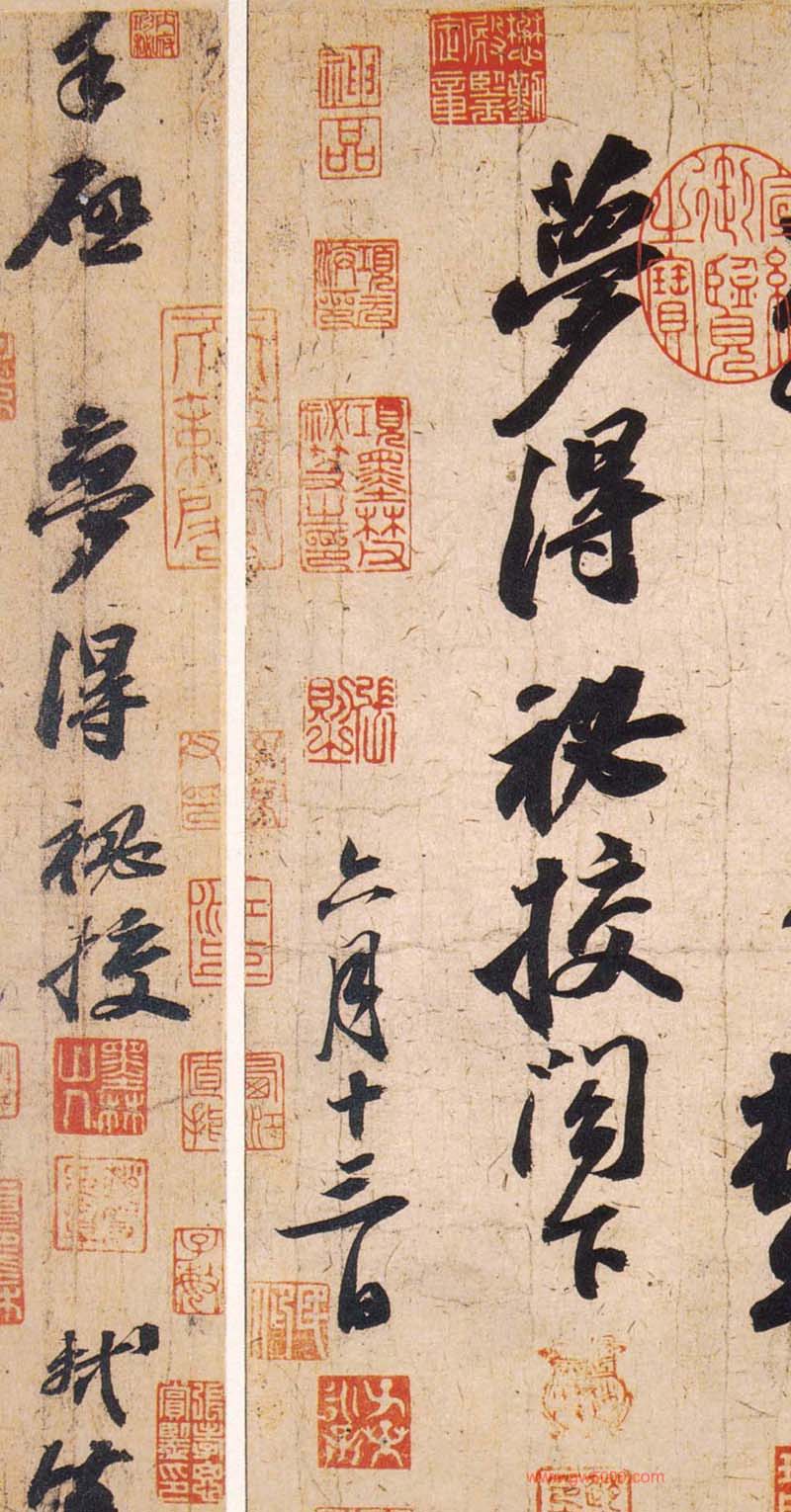 宋苏轼《致梦得秘校尺牍》,又名《渡海帖》,宋元符三年,苏轼被诏徙廉州,路过澄迈时未遇赵梦得,便留此札。为其晚年书迹之代表,通篇章法参差不齐,长短各宜,字法大小错落,一任自然,墨色淋漓,厚重丰腴、沉著痛快。尤其是字越写到后面越放纵,无间心手,忘怀楷则。笔墨间透出郁郁芊芊之气,给人以超尘拔俗之感。
