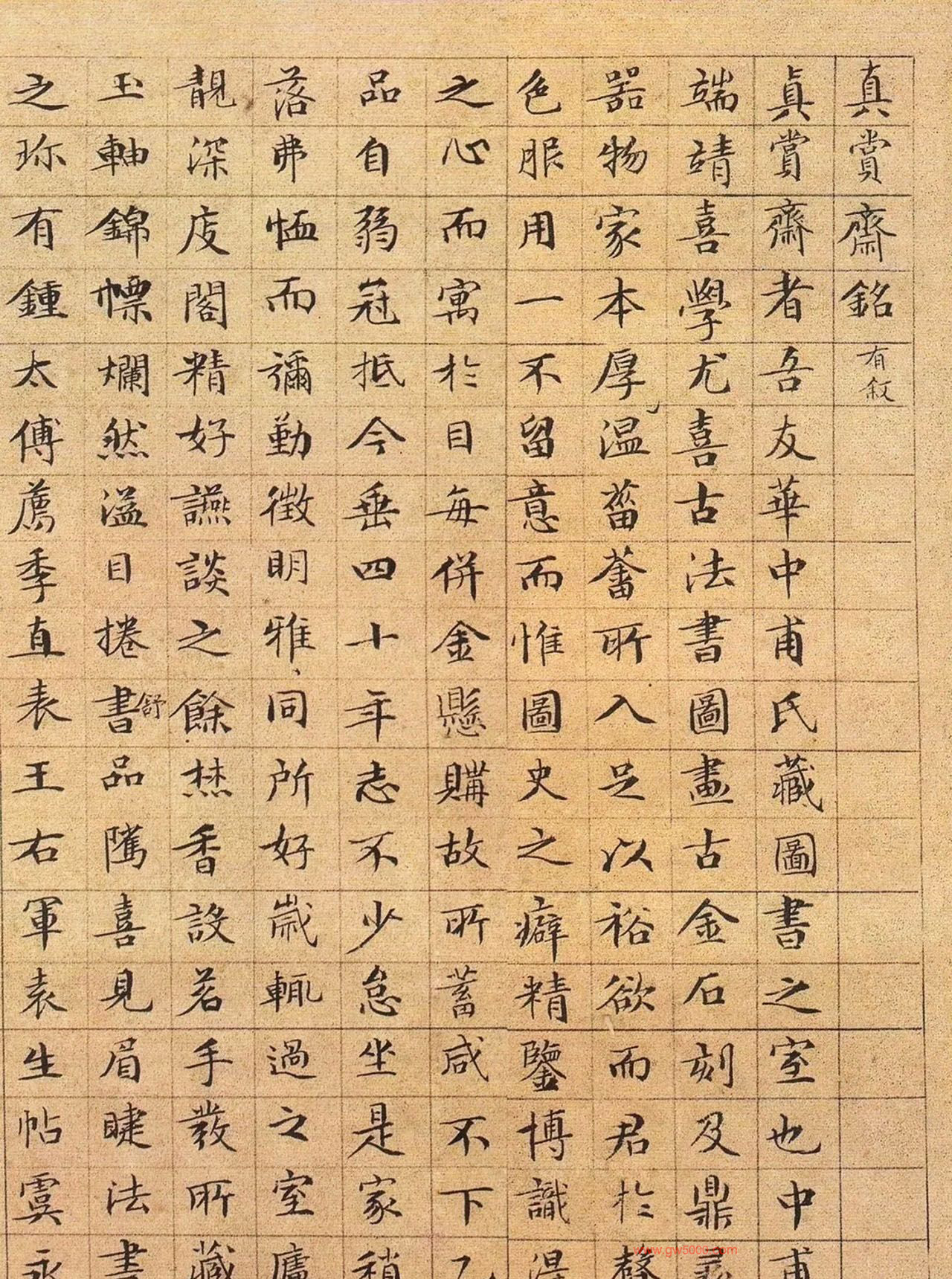 《真赏斋铭有叙》是他为当时著名的收藏家、真赏斋主人华夏(字中甫)所作《真赏斋图》题写的小楷款识,计四十行。嘉靖丁巳(1557年),文徵明虽已八十八岁,依旧字字端严,骨力劲健,真可谓人书俱老。